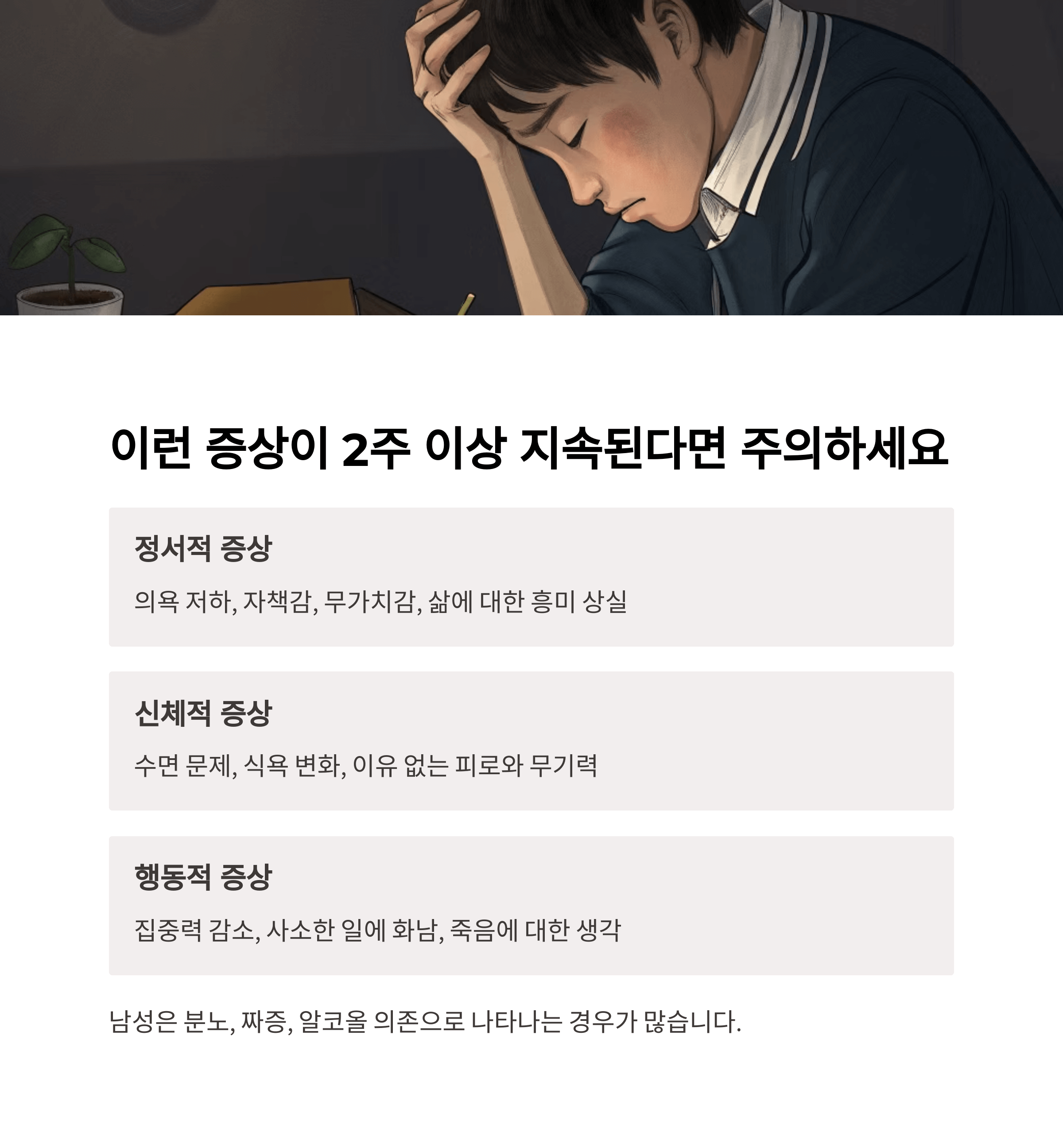 특히 남성은 ‘우울하다’는 감정을 표현하는 데 익숙하지 않아, 알코올 의존, 분노, 공격성으로 나타나는 경우도 많습니다.
