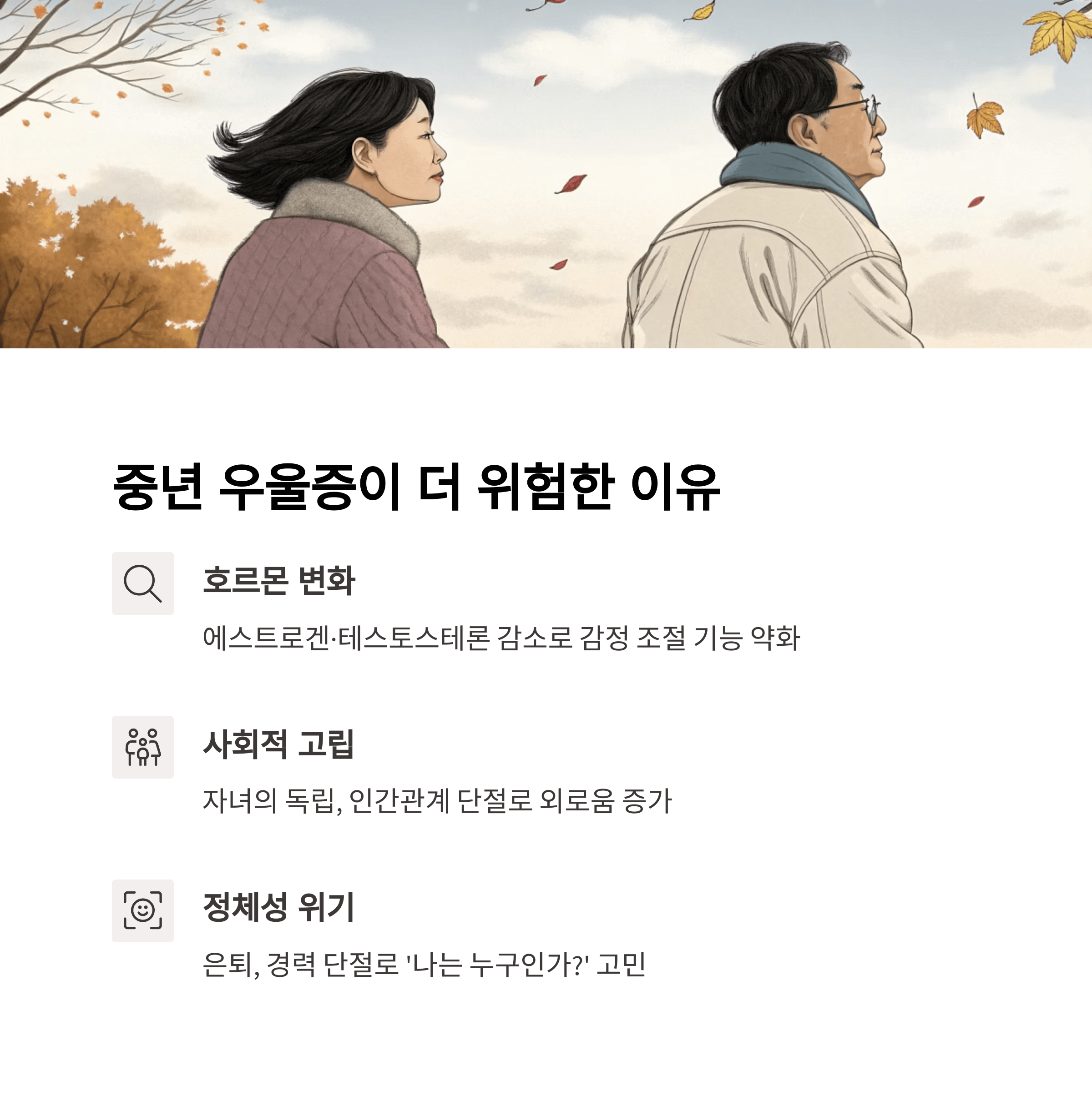 우울증은 ‘마음의 감기’로 불릴 만큼 누구나 겪을 수 있는 심리 질환입니다. 하지만 중년기에 찾아오는 우울증은 단순한 기분 저하를 넘어, 신체 건강과 삶의 방향성까지 위협할 수 있습니다. 특히 50대 전후에는 호르몬 변화, 역할 상실감, 노화 인식 등이 복합적으로 작용해 우울증 발병률이 높아집니다.