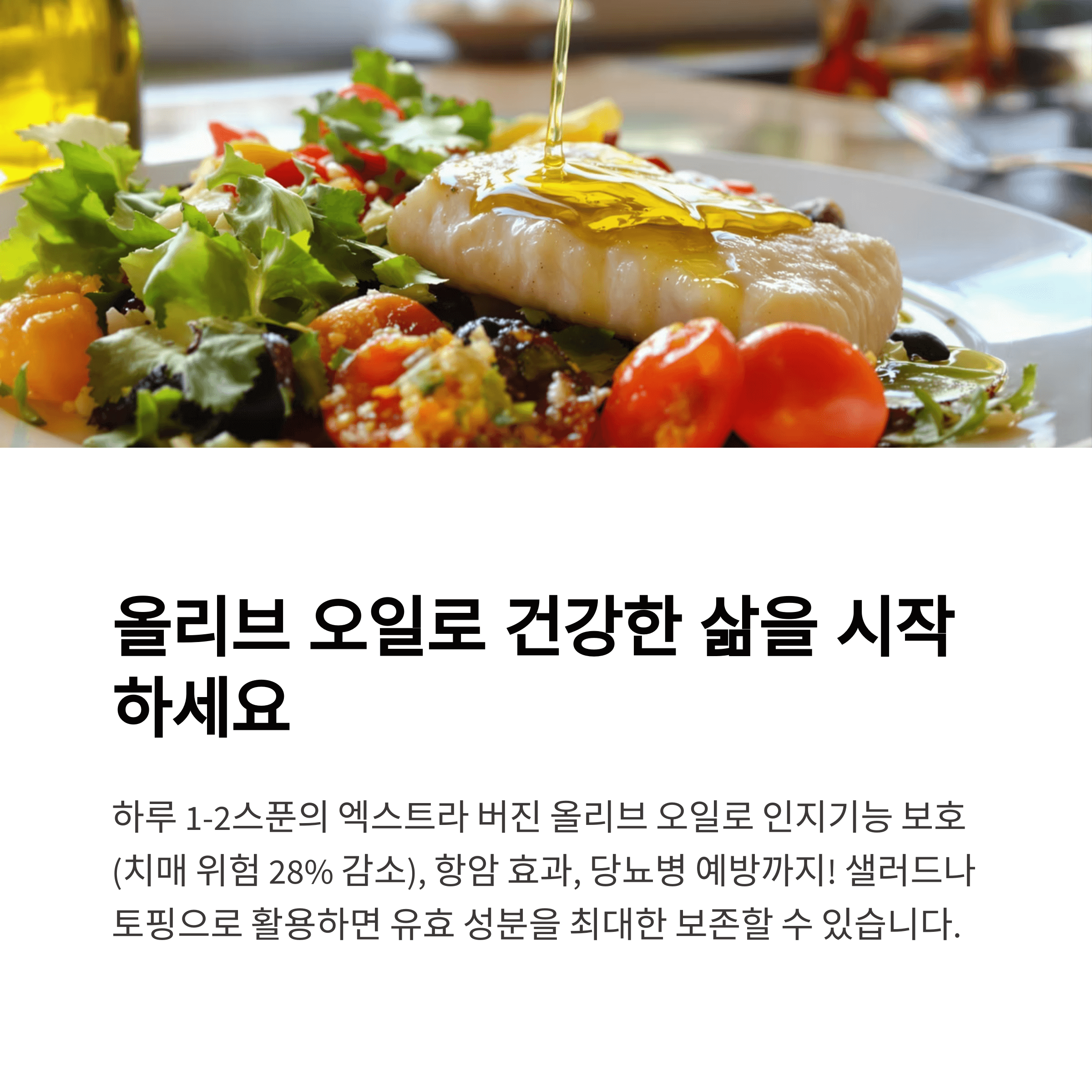 올리브 오일의 폴리페놀은 베타 아밀로이드 생성을 억제하여 알츠하이머병 예방에 도움을 줍니다. 치매로 인한 사망 위험이 28% 낮아졌다는 대규모 연구도 있습니다.