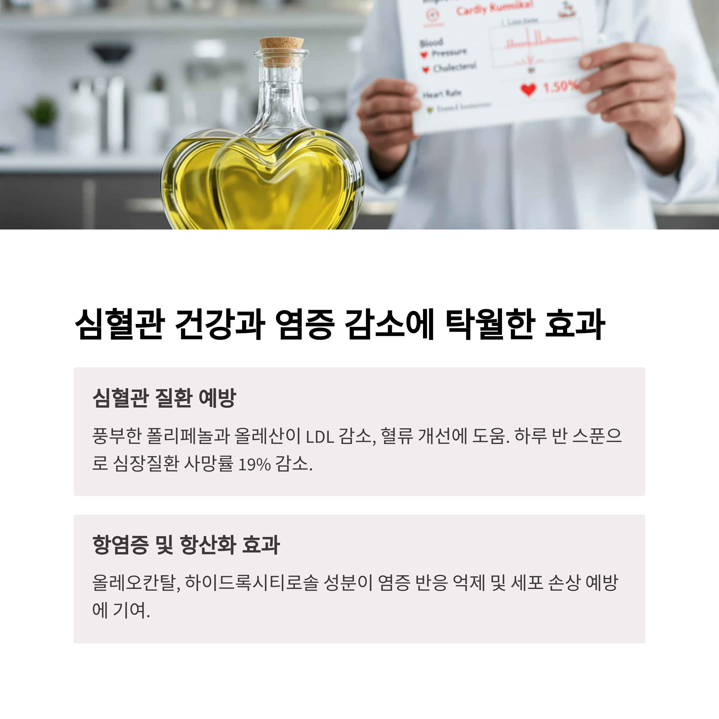 올레오칸탈, 하이드록시티로솔 등 성분이 염증 반응 억제 및 세포 손상 예방에 기여합니다. 염증 지표인 CRP 수치 감소에도 도움이 되며, 만성 질환 예방에 효과적입니다.