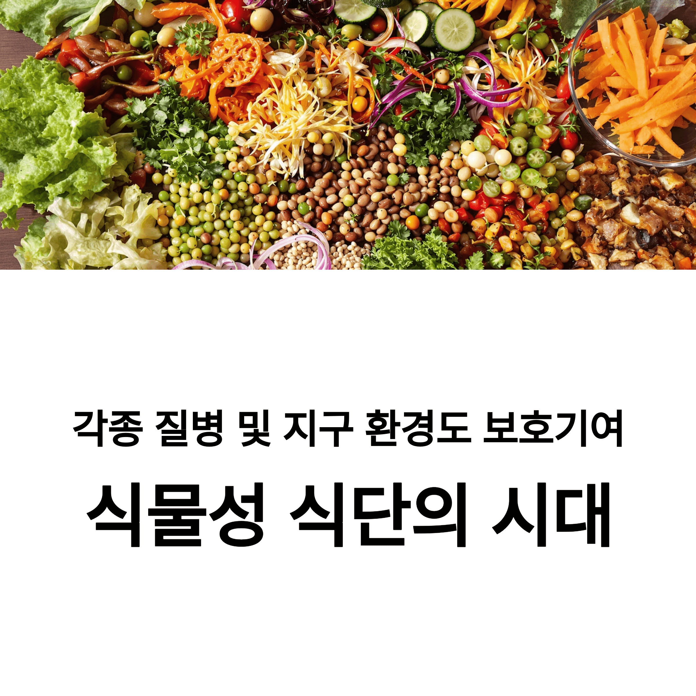 식물성 식단은 심혈관 질환, 당뇨병, 비만 등 만성 질환 예방에 도움이 될 뿐 아니라, 탄소 배출량과 물 사용량을 줄여 지속 가능한 지구 환경을 보호하는 데에도 기여합니다. 실제로 유엔(UN)과 WHO도 지구 온난화를 줄이기 위한 식생활 변화의 핵심으로 '플랜트 베이스 식단'을 강조하고 있습니다.