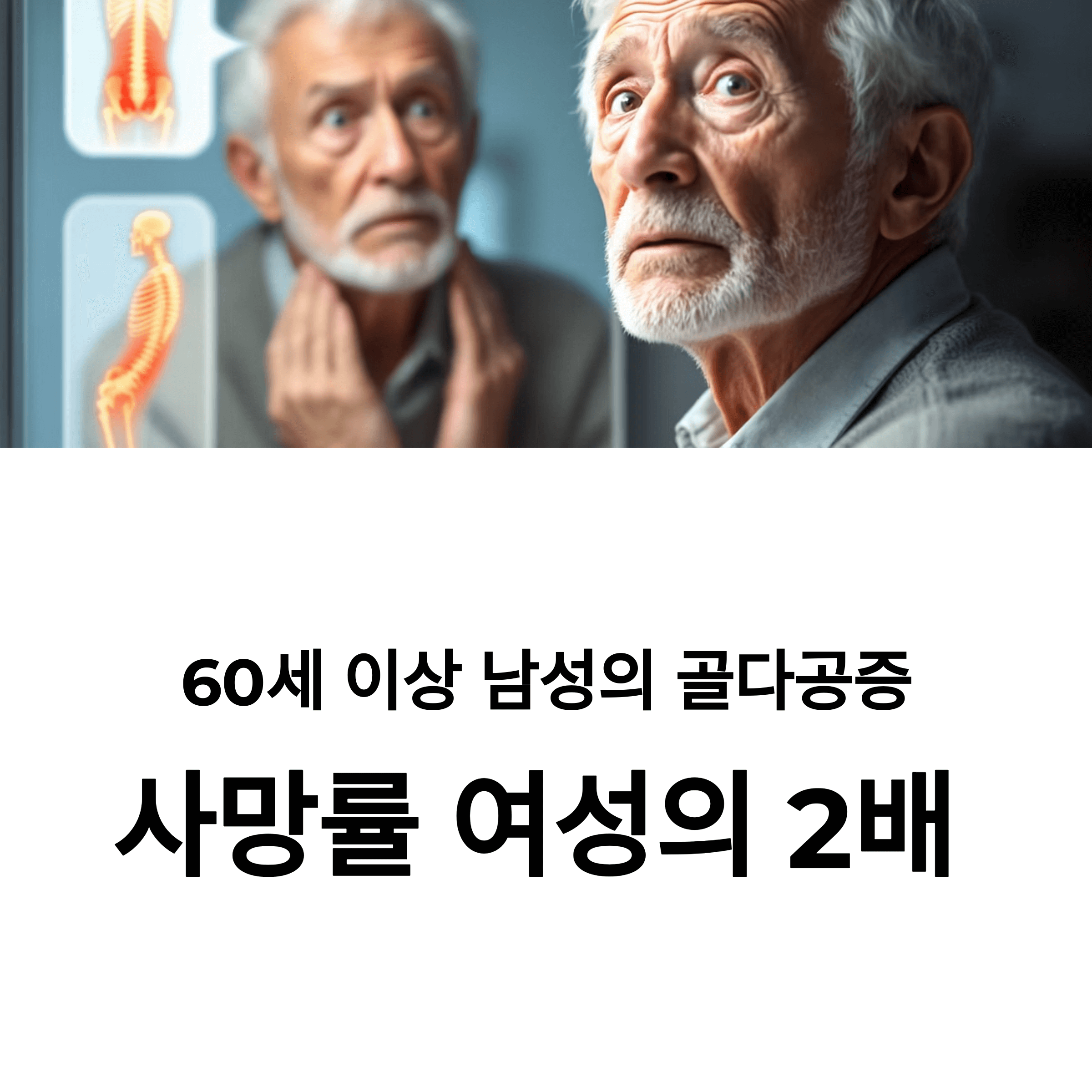 남성은 여성보다 골다공증 발생 시기가 늦고, 진행 속도도 느리지만 치명률은 훨씬 높습니다.