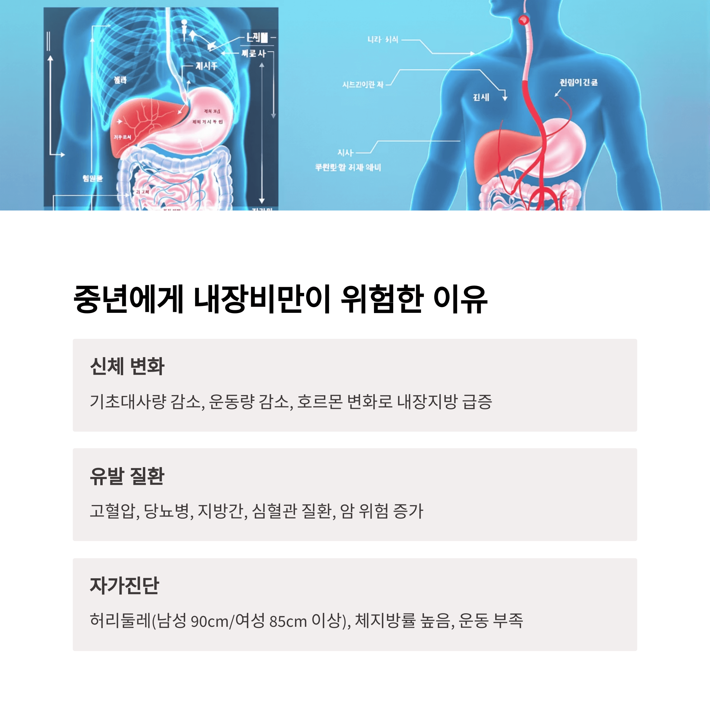 즉, 내장지방은 '보이지 않는 뱃살'이지만 훨씬 더 위험합니다.