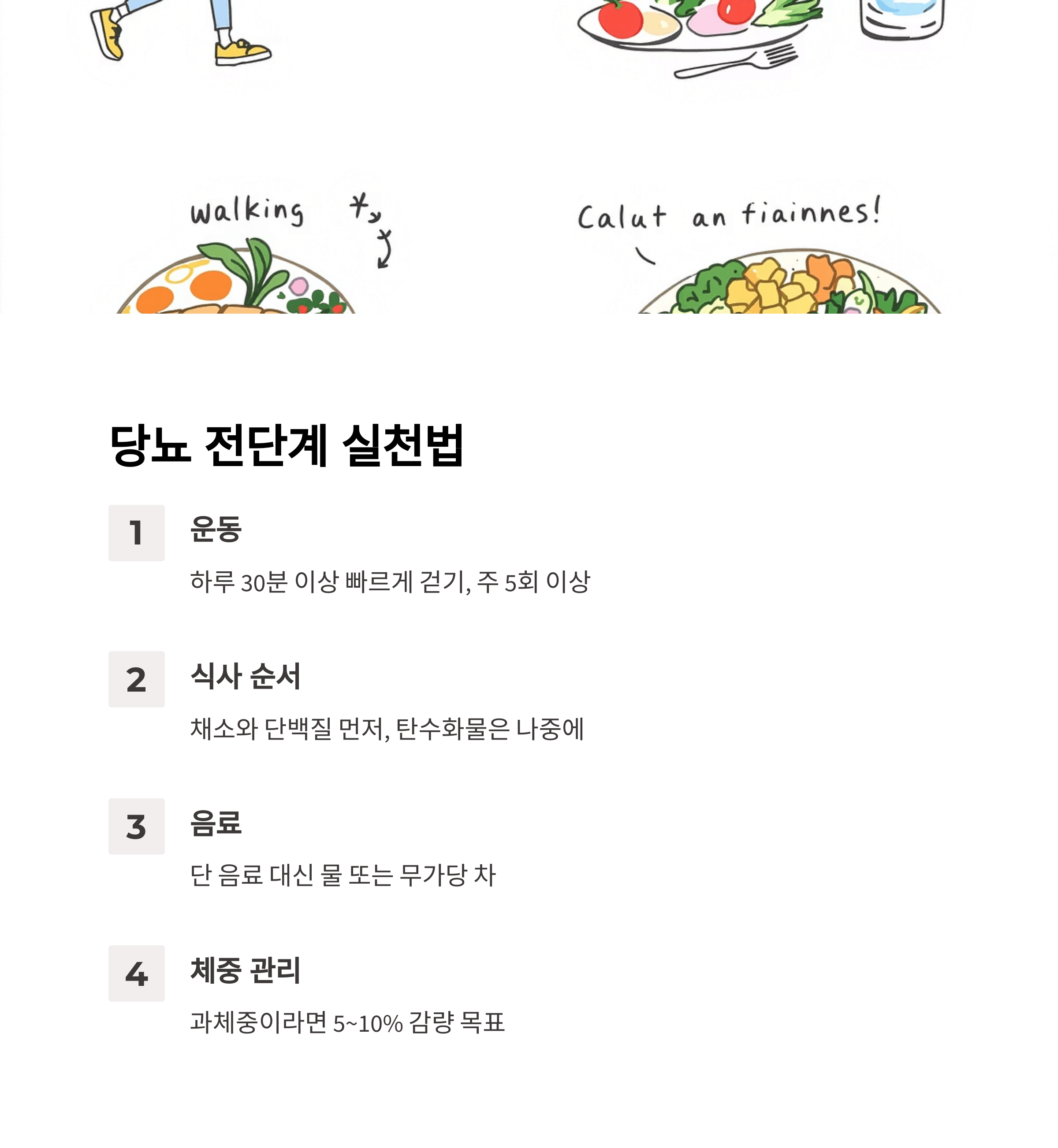 - 매끼 식사에 채소와 단백질을 먼저 섭취하고 탄수화물은 나중에