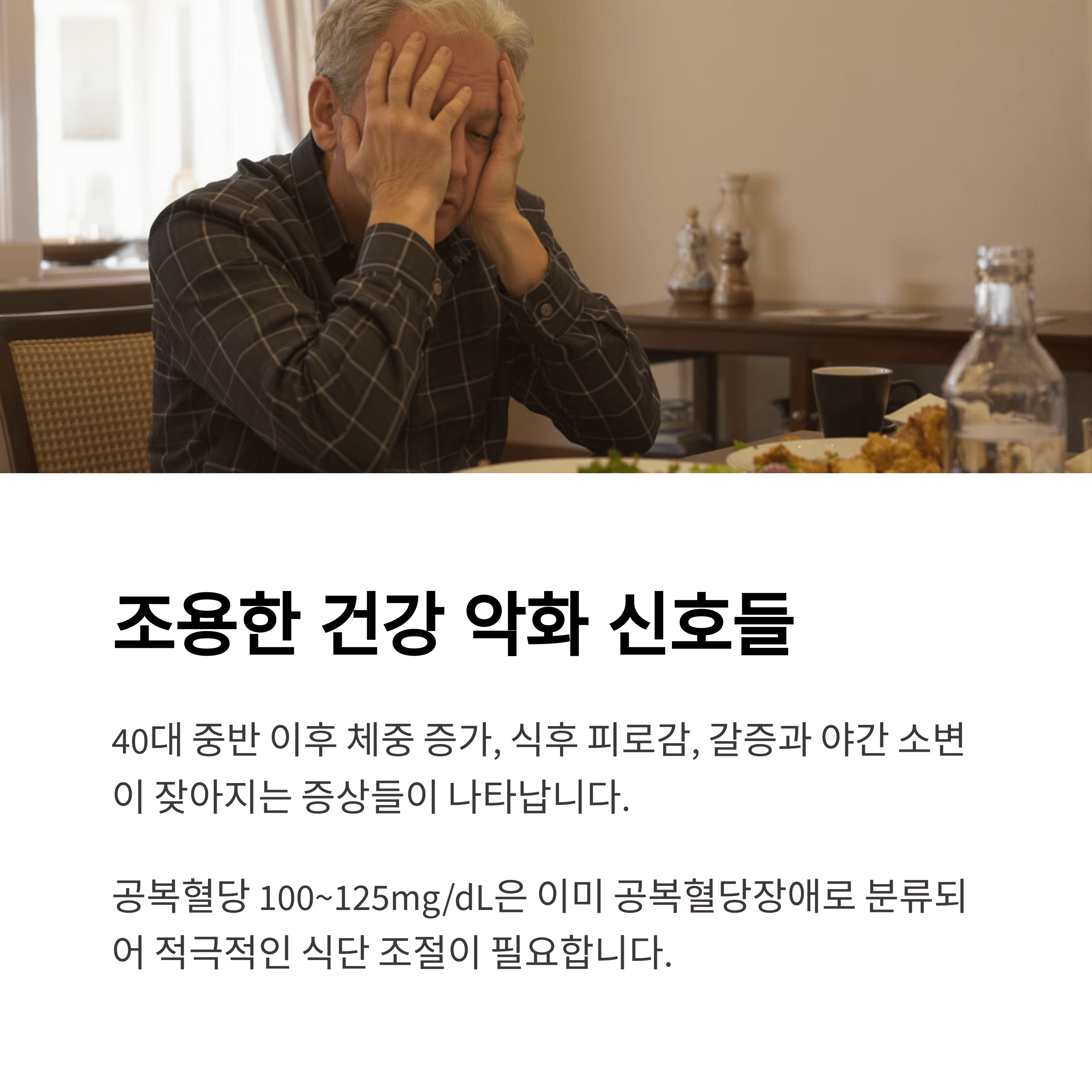 40대 중반 이후부터 체중이 조금씩 늘고, 식후 피로감이 심해지며, 평소보다 갈증이나 야간 소변이 잦아지는 경우가 있습니다. 이런 변화는 당뇨 전단계 또는 고혈압 초기 증상일 수 있습니다.
