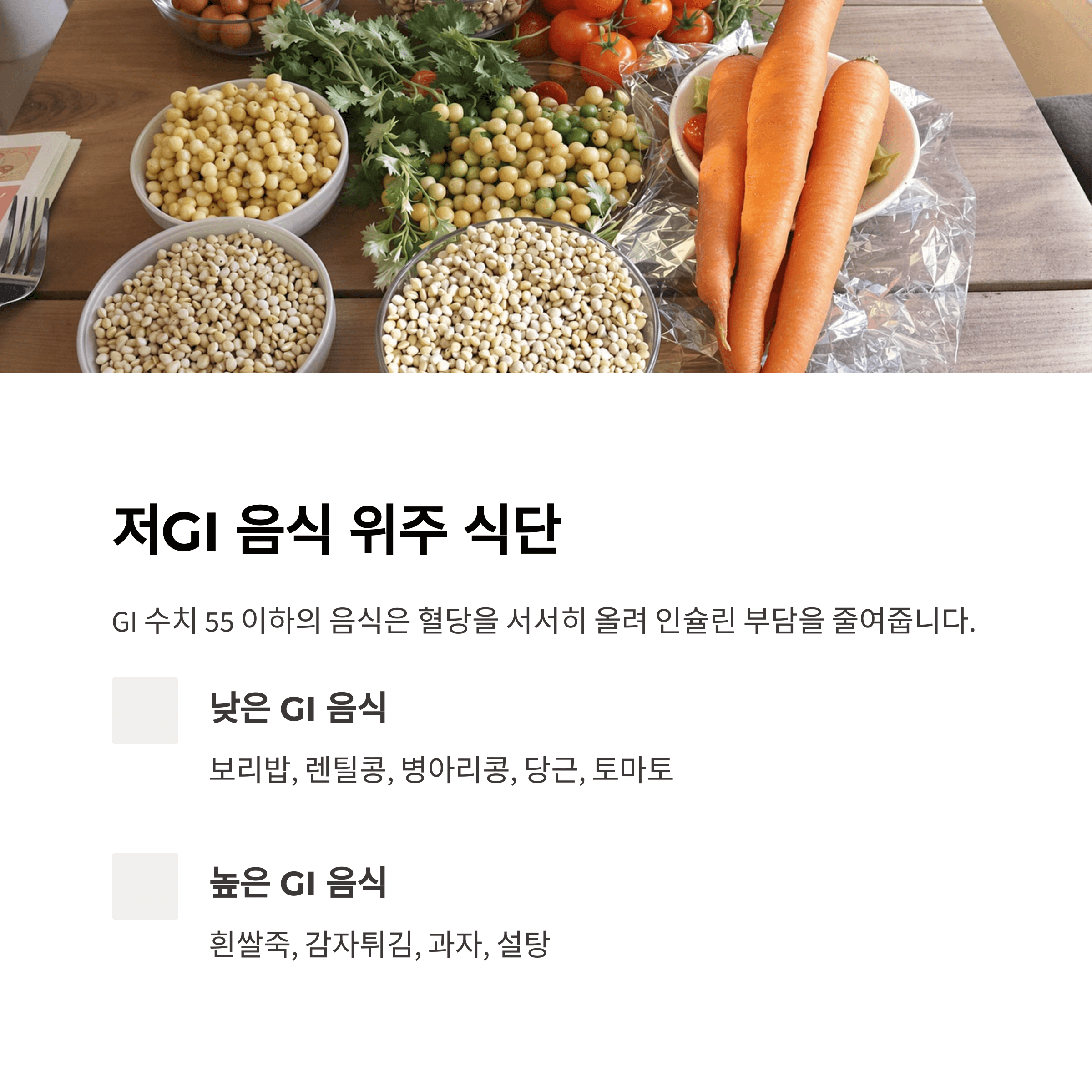 - 낮은 GI 음식: 보리밥, 렌틸콩, 병아리콩, 당근, 토마토