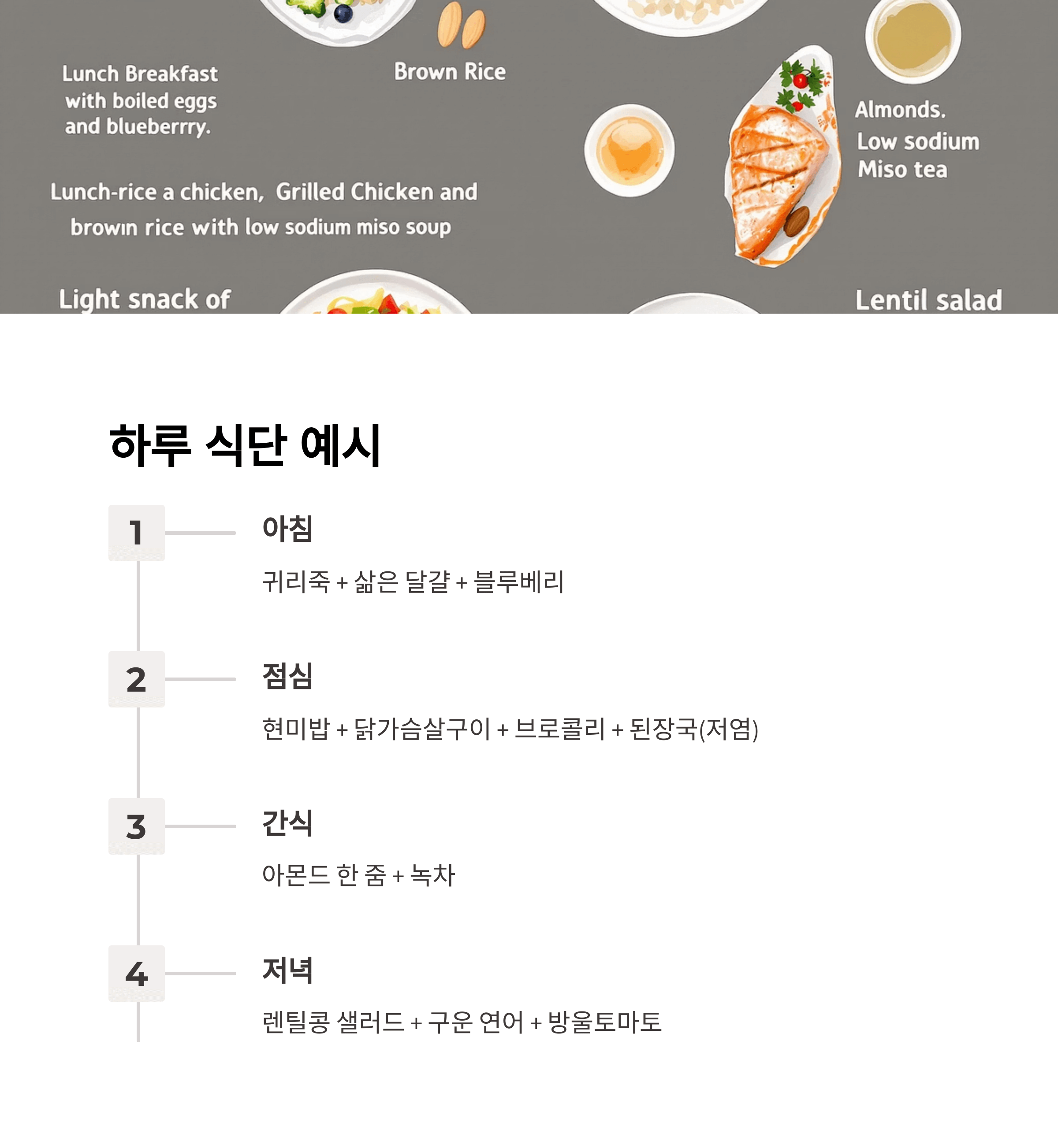 - 지양 음식: 흰쌀밥, 과일주스, 설탕 첨가 시리얼