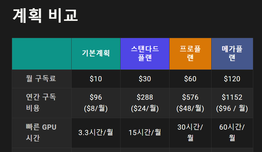세 가지 유료 플랜은 월간 구독 기준 각각 $10(Basic), $30(Standard), $60(Pro)입니다. 연간 구독 시 매월 20% 할인된 가격이 적용됩니다. 저도 오늘 Basic 플랜으로 월간으로 한달 $10 결재했습니다. 한달 써보고 나서 추후 연간으로 결재할지 결정하려고 합니다.