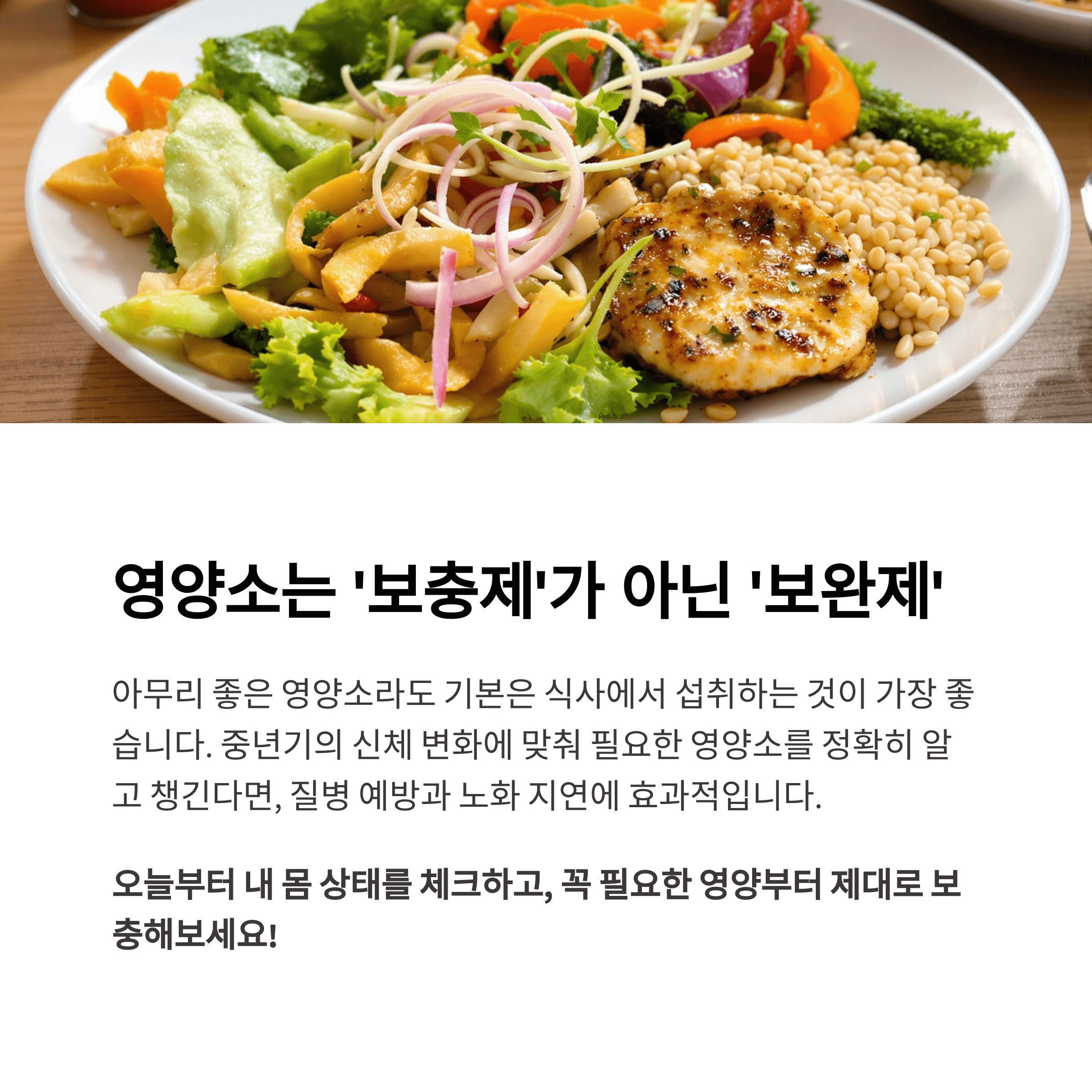 비타민은 만능이 아닙니다. 하지만 **중년기의 신체 변화에 맞춰 필요한 영양소를 정확히 알고 챙긴다면**, 질병 예방과 노화 지연에 분명한 효과가 있습니다.