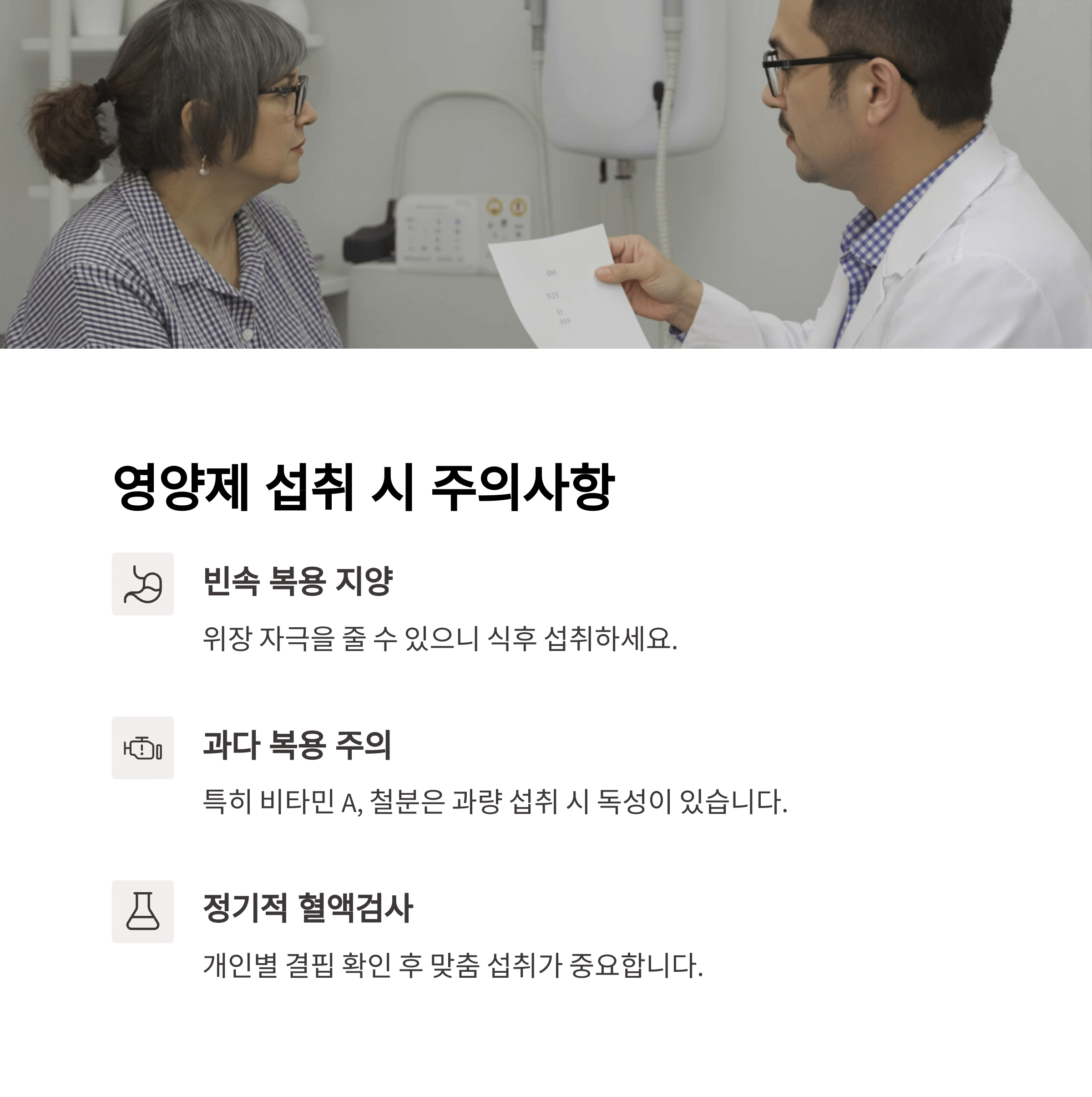 - 정기적인 혈액검사 병행: 개인별 결핍 확인 후 맞춤 섭취 권장