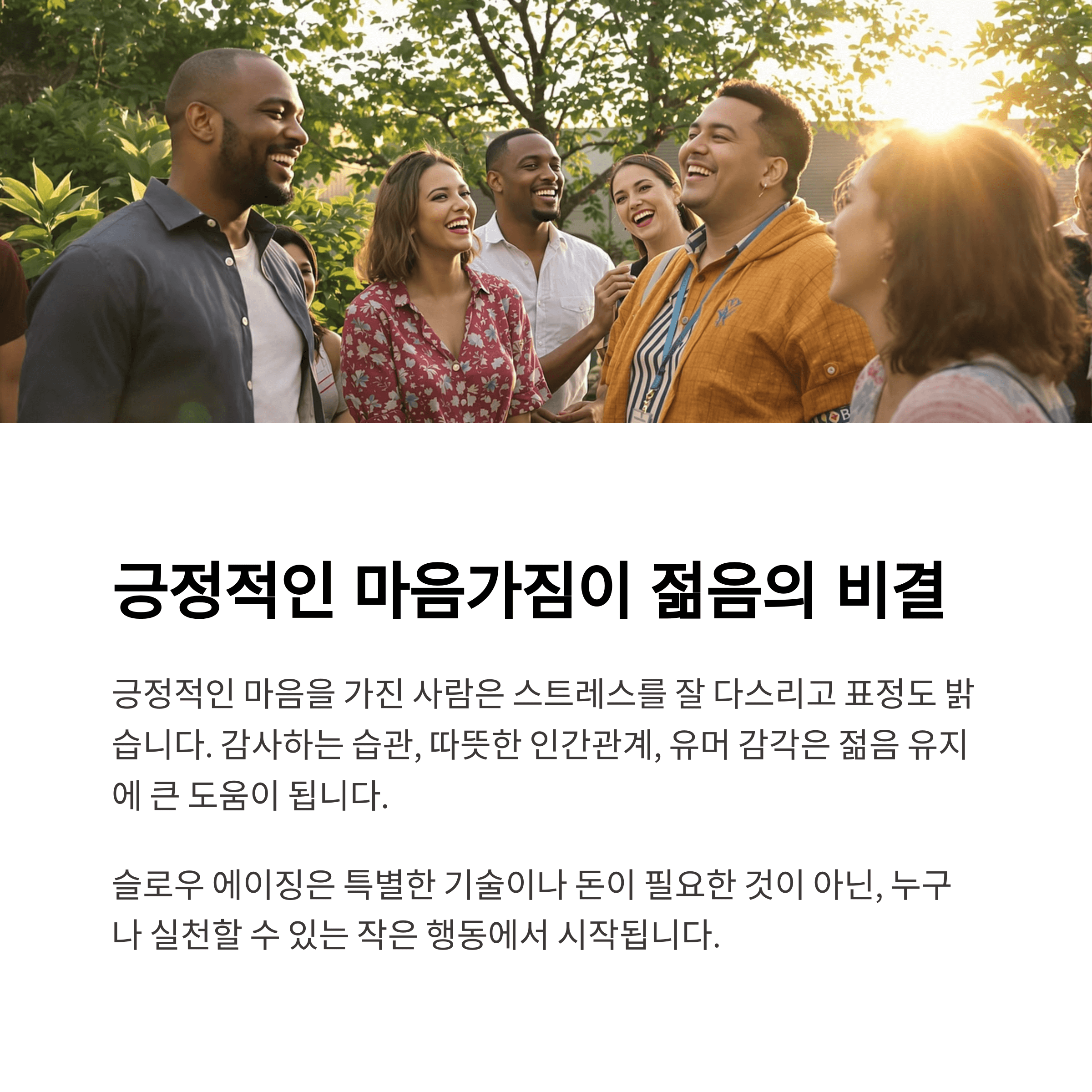 긍정적인 마음을 가진 사람은 스트레스를 잘 다스릴 뿐 아니라, 표정도 밝고 활기가 넘칩니다. 감사하는 습관, 주변 사람들과 따뜻한 관계 유지, 유머 감각을 키우는 것만으로도 젊음을 유지하는 데 큰 도움이 됩니다.