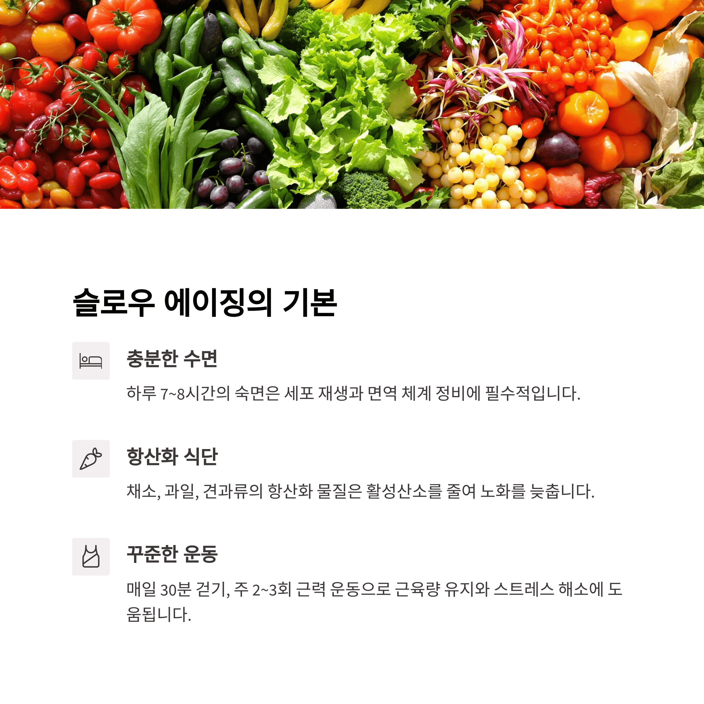 사람마다 나이가 들며 겪는 변화는 다릅니다. 어떤 사람은 60대에도 피부가 맑고 활력 넘치는 반면, 누군가는 30대부터 만성 피로나 잦은 질병에 시달리기도 하죠. 이런 차이는 유전적인 요인도 있지만, 더 큰 비중은 생활습관입니다. 지금부터라도 좋은 습관을 들이면 누구나 슬로우 에이징을 실천할 수 있습니다.