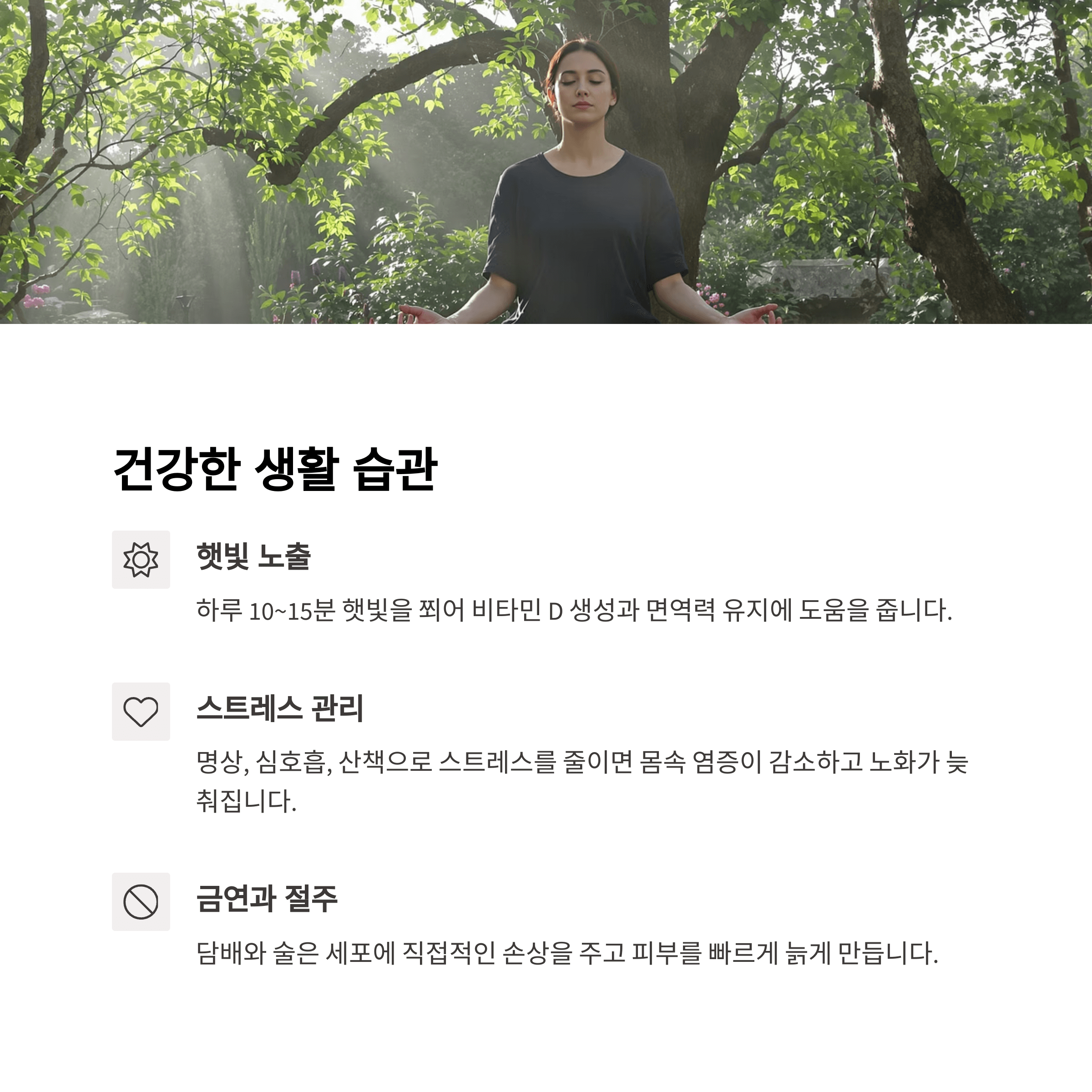 이렇게 일곱 가지 습관을 실천하면 단순히 외모뿐 아니라 몸속 건강까지 젊게 유지할 수 있습니다. 슬로우 에이징은 특별한 기술이나 돈이 필요한 게 아니라, 누구나 실천할 수 있는 작은 행동에서 시작됩니다.