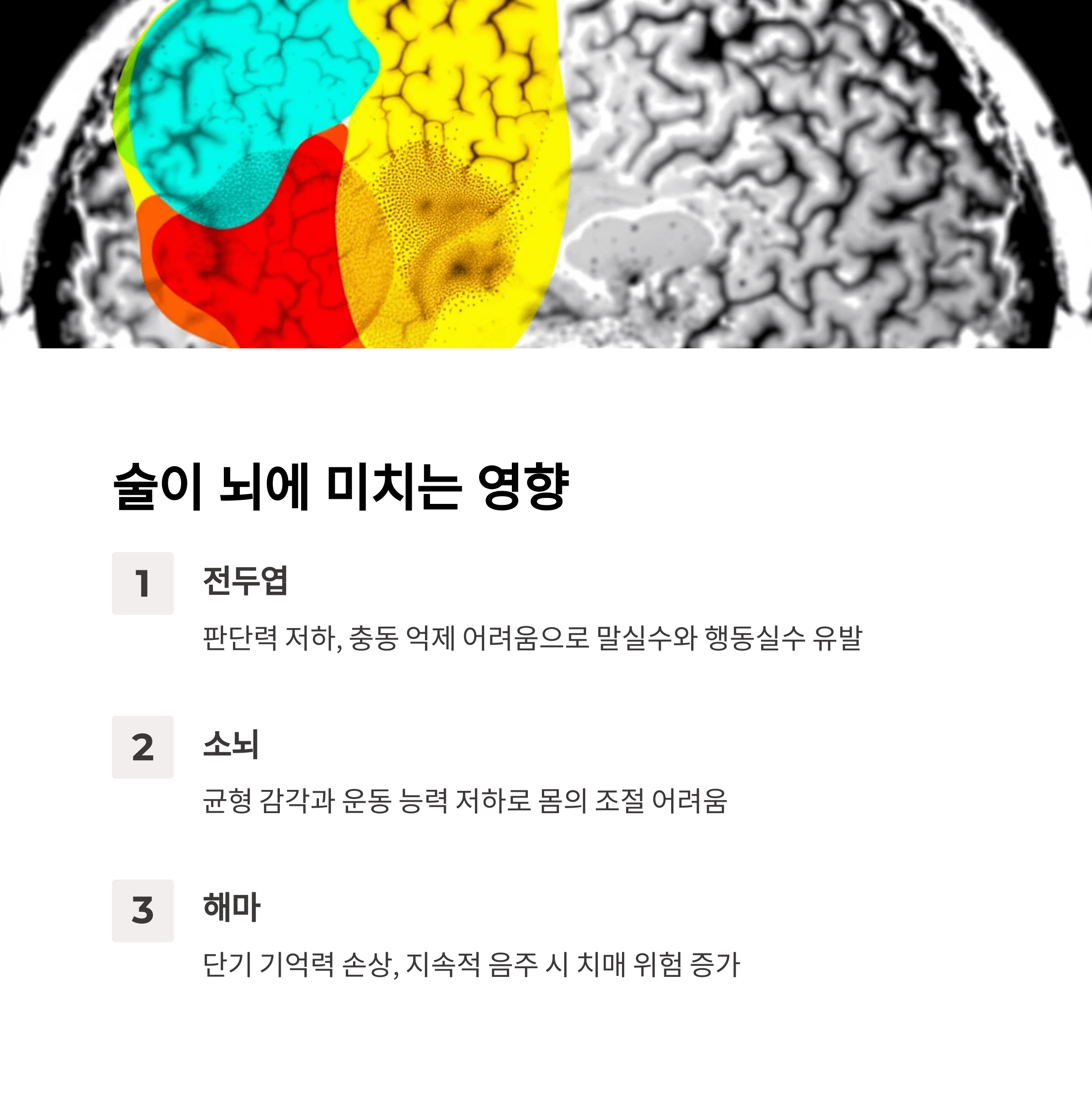 지속적인 음주는 뇌 구조 자체에 변화를 주고, 기억력과 사고력에 악영향을 미칩니다.