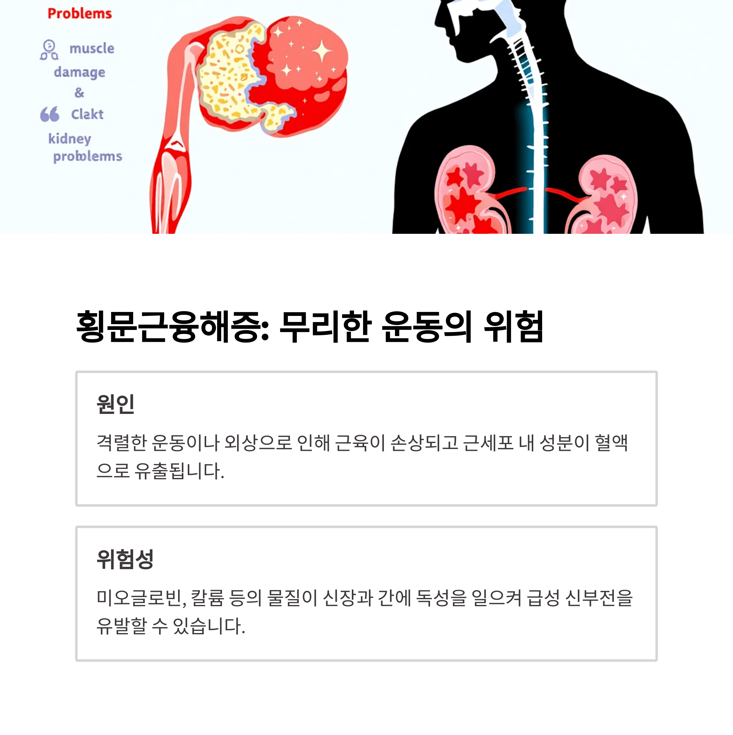 격렬한 운동을 갑자기 시작하거나, 평소보다 훨씬 강도 높은 운동을 반복하면 근육 세포가 파괴되고, 그 부산물이 혈액을 타고 돌면서 신장 등 장기에 부담을 줍니다.