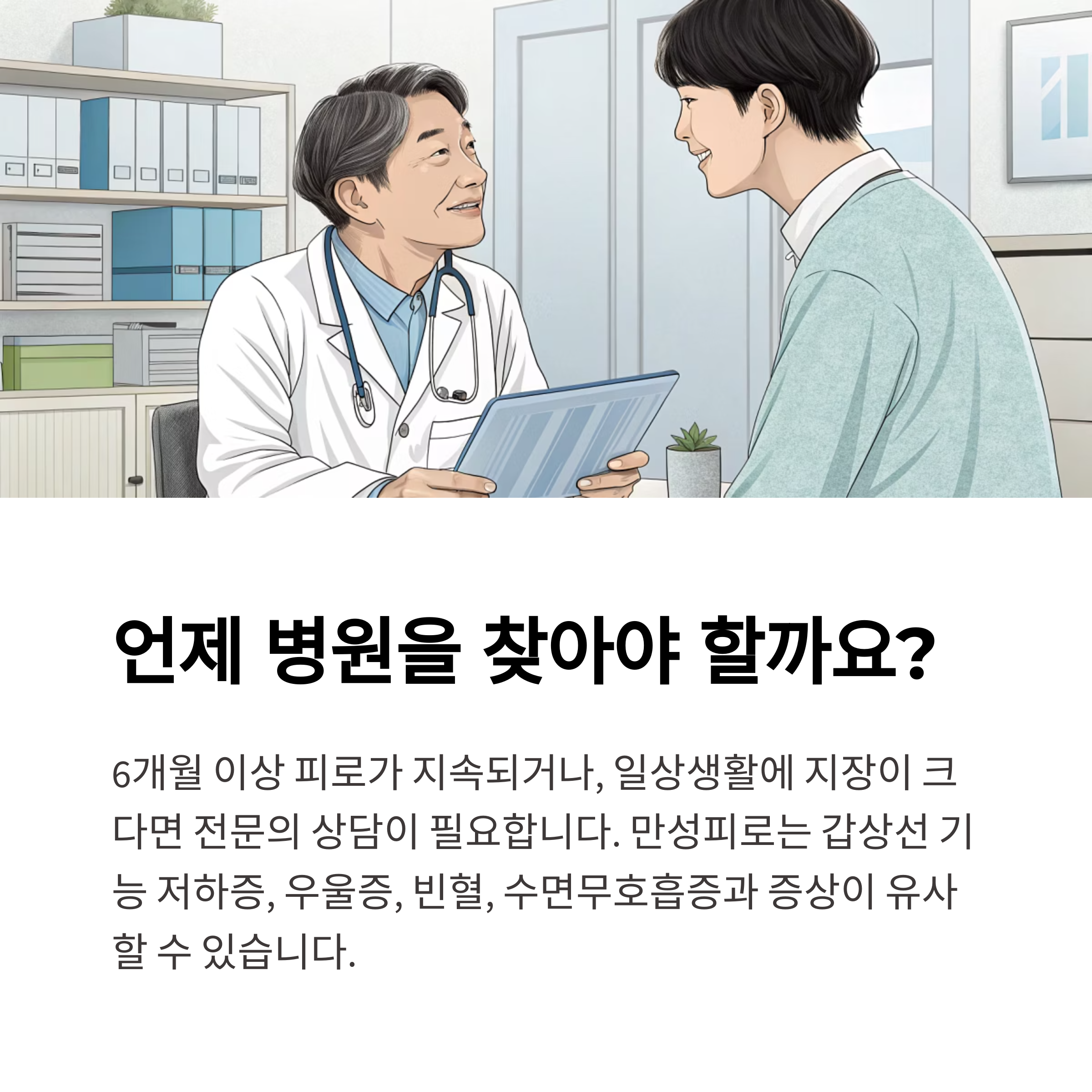 A. 일반적인 피로는 휴식을 통해 회복되지만, 만성피로는 충분한 휴식 후에도 피로가 지속됩니다. - Q. 만성피로는 치료가 가능한가요?
