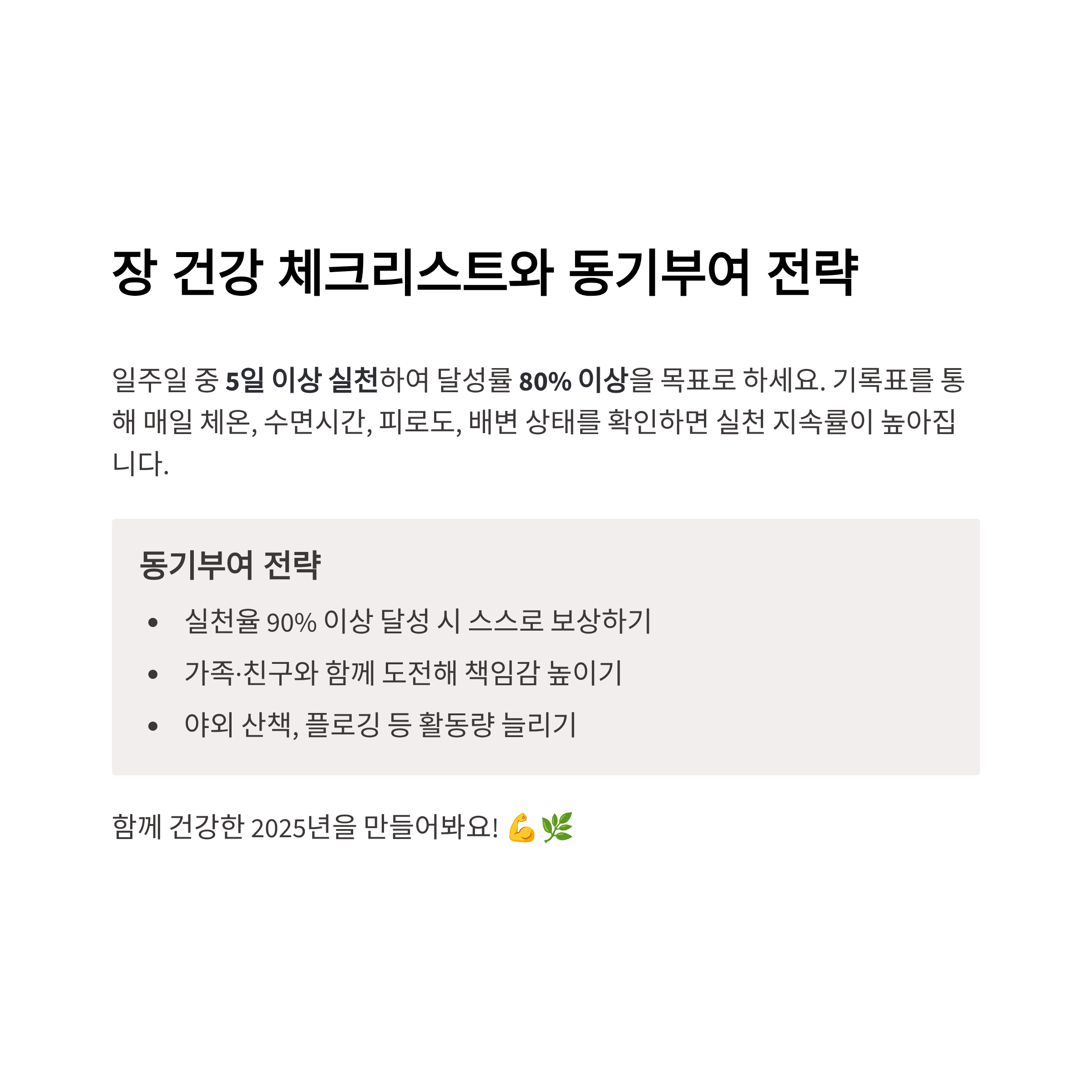 - 2025년 최신 트렌드는 식습관, 생활습관, 보조제 활용을 통한 체계적 장 건강 관리입니다.