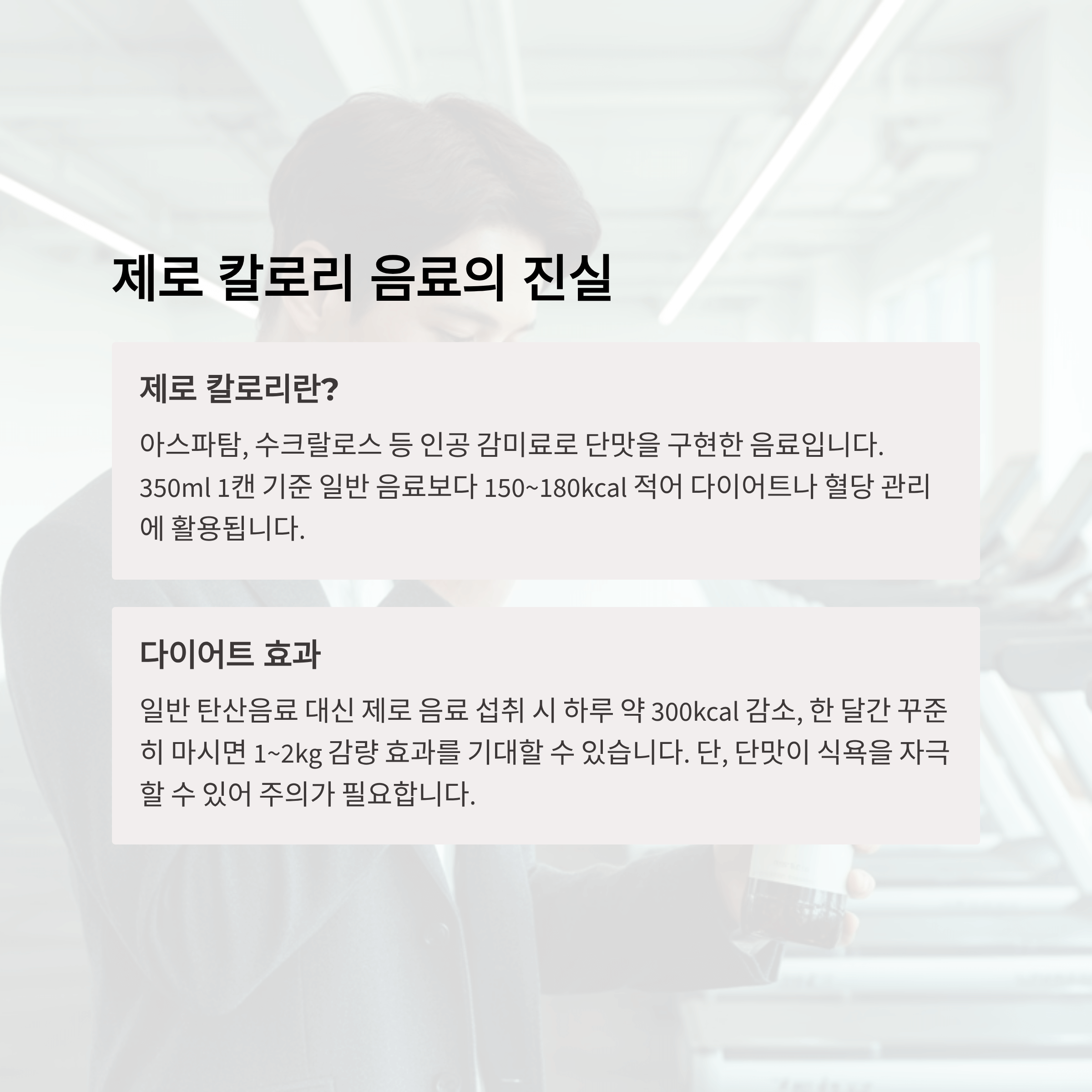 제로 칼로리 음료는 아스파탐, 수크랄로스, 에리트리톨 등 인공 감미료를 사용해 설탕 없이도 단맛을 구현한 음료입니다. 350ml 1캔 기준, 기존 설탕 음료 대비 150~180kcal가량 열량을 줄일 수 있어 다이어트를 시작한 사람이나 혈당을 관리해야 하는 경우에 대체재로 활용되고 있습니다.