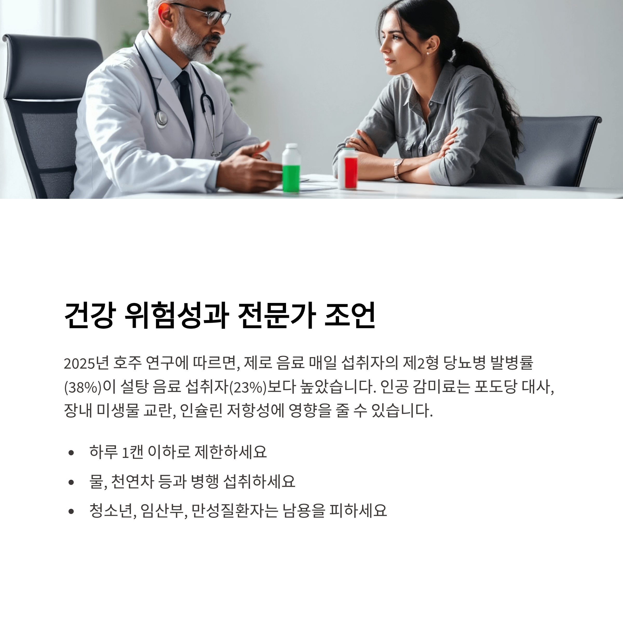 2025년 발표된 호주 모나시대·RMIT 공동 연구(36,600명, 14년 추적)에 따르면, 제로 음료를 매일 섭취한 사람의 제2형 당뇨병 발병률(38%)이 설탕 음료 섭취자(23%) 보다 더 높았다는 결과가 나왔습니다.
