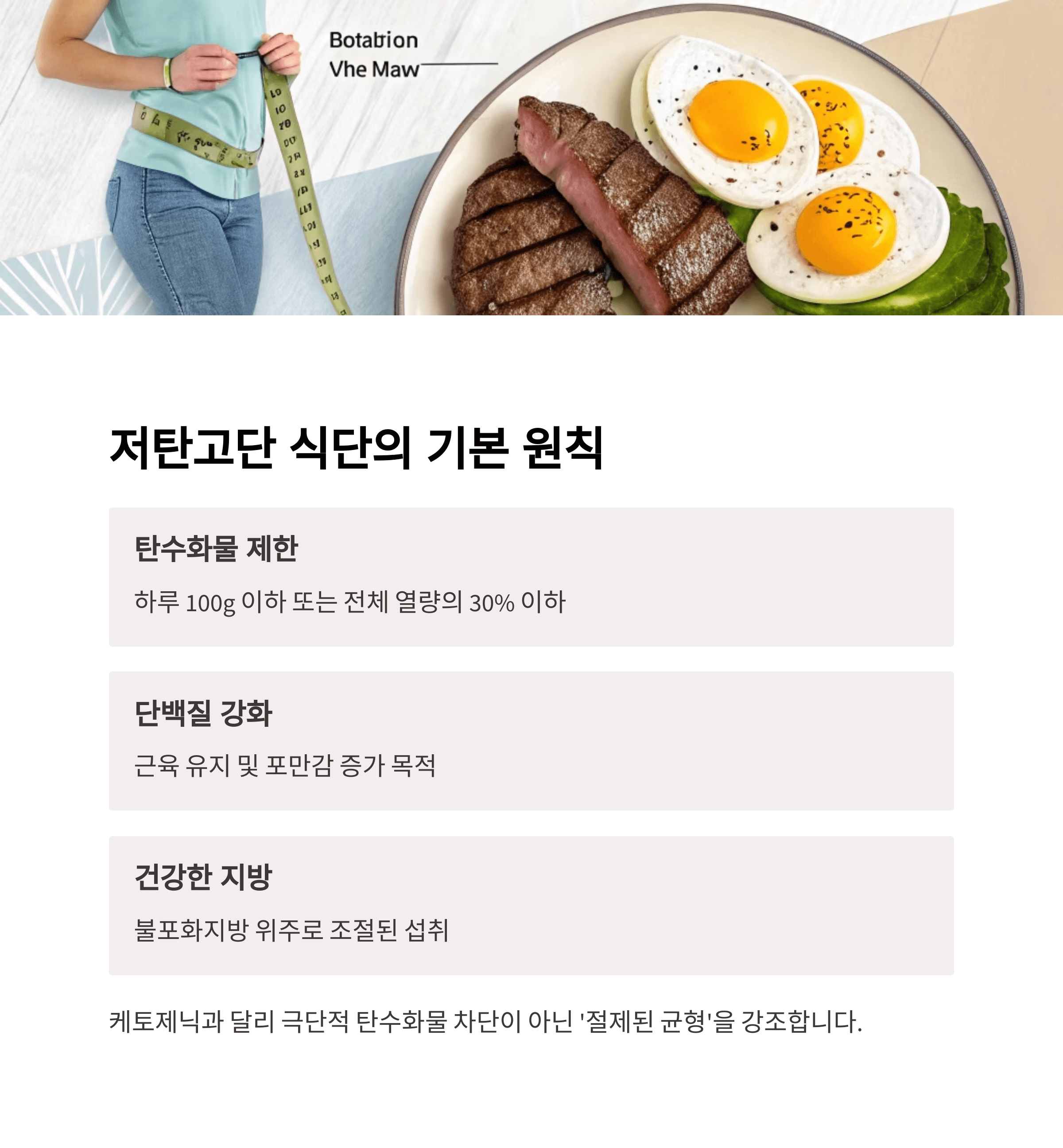 저탄고단 식단은 다음과 같은 원칙을 기반으로 합니다: