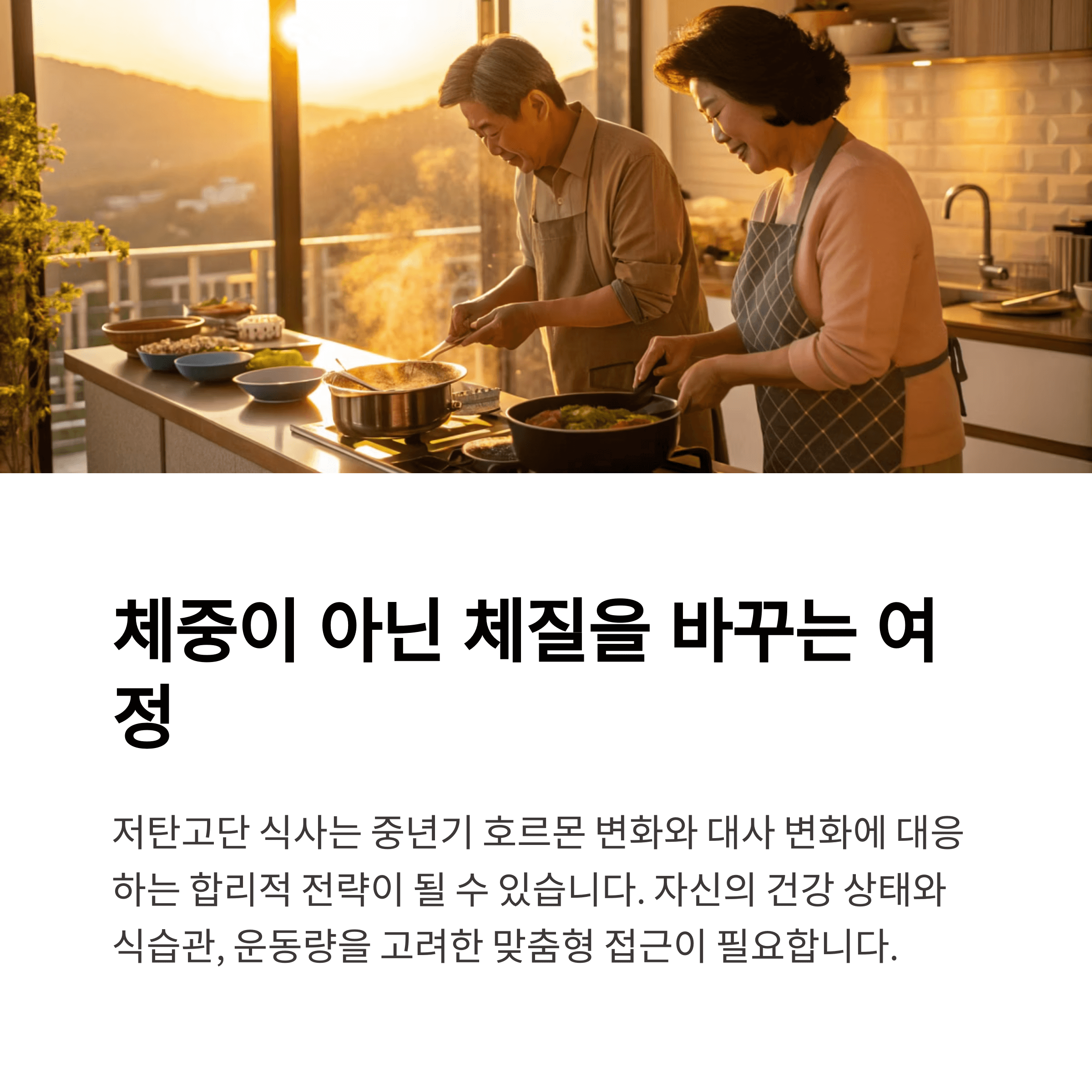 저탄고단 식사는 중년기의 호르몬 변화와 대사 변화에 대응하기 위한 합리적인 전략이 될 수 있습니다. 그러나 모든 사람에게 무조건적인 정답은 아니며, 자신의 건강 상태와 식습관, 운동량을 고려해 맞춤형 조절이 필요합니다.