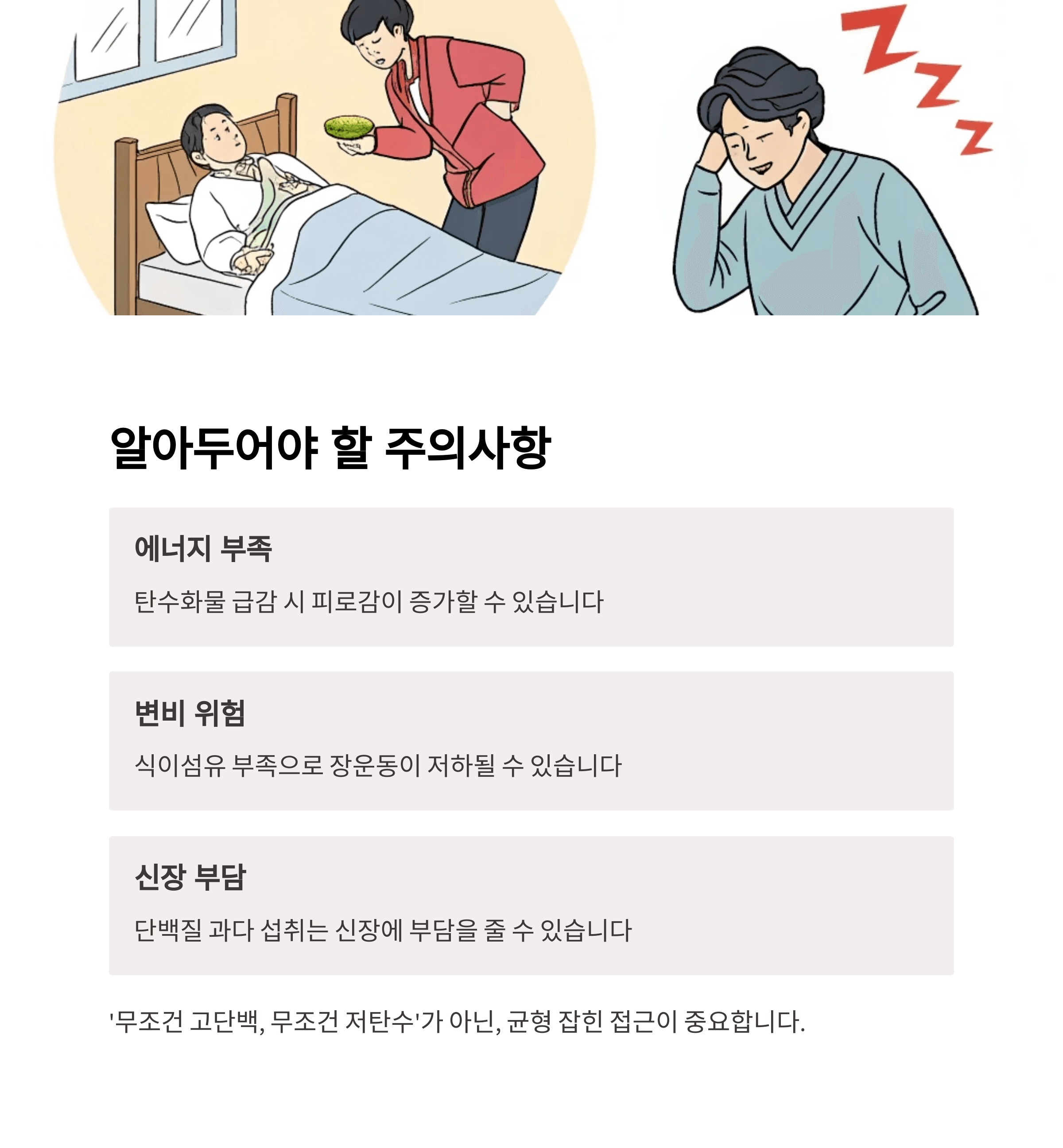- 단백질 과다: 신장에 부담 (신장질환자 주의)