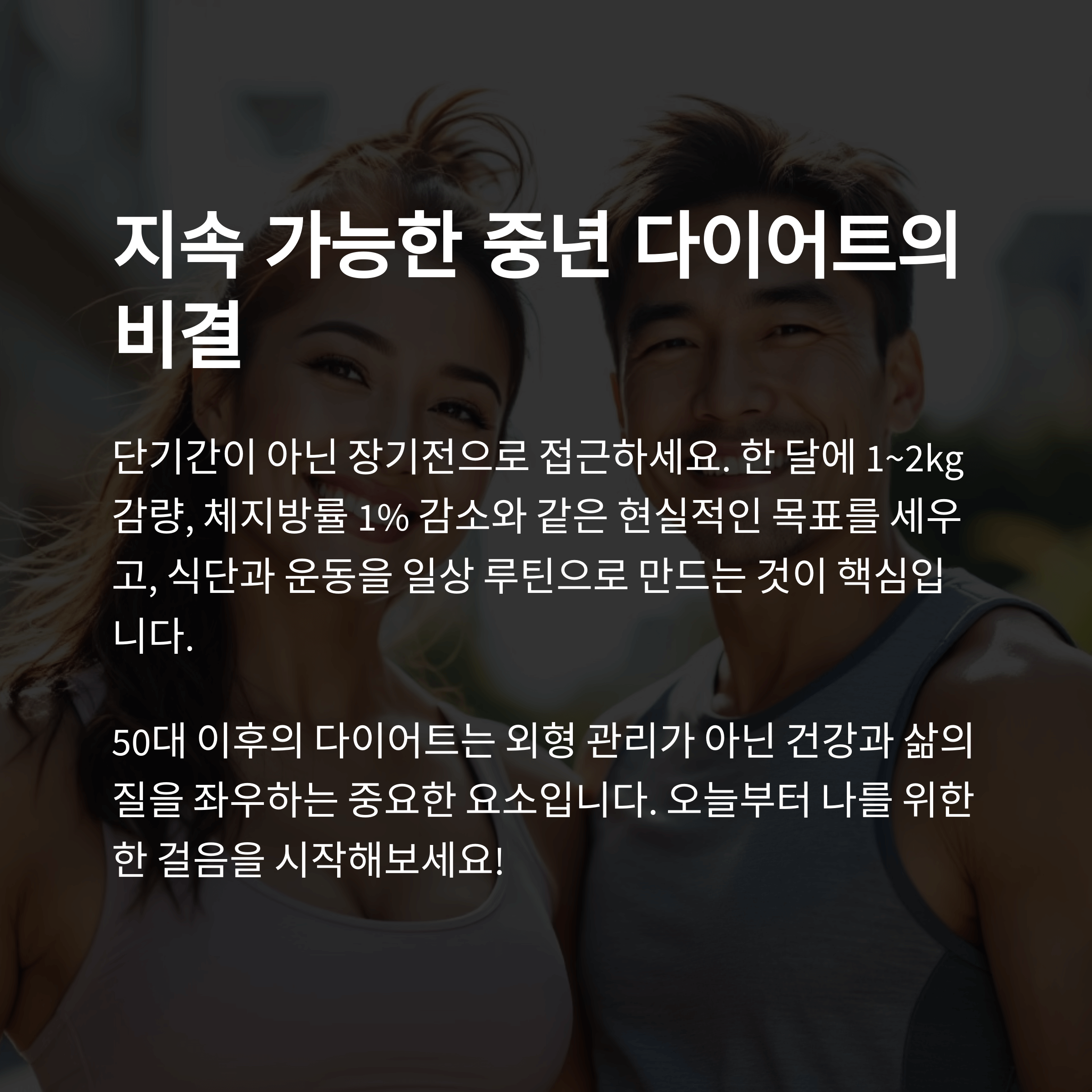 따라서 중년의 다이어트는 단순히 숫자 줄이기가 아닌, 지방은 줄이고 근육은 유지 또는 늘리는 방향으로 접근해야 합니다.