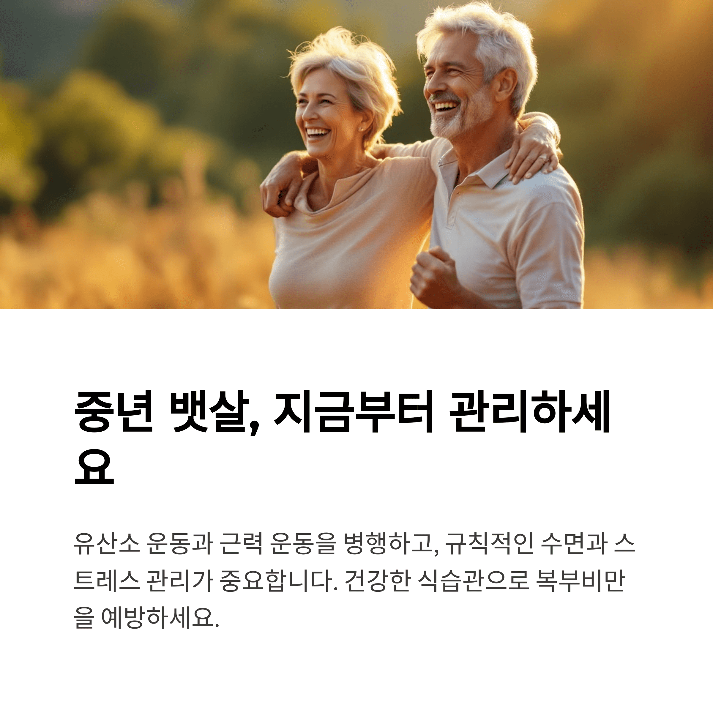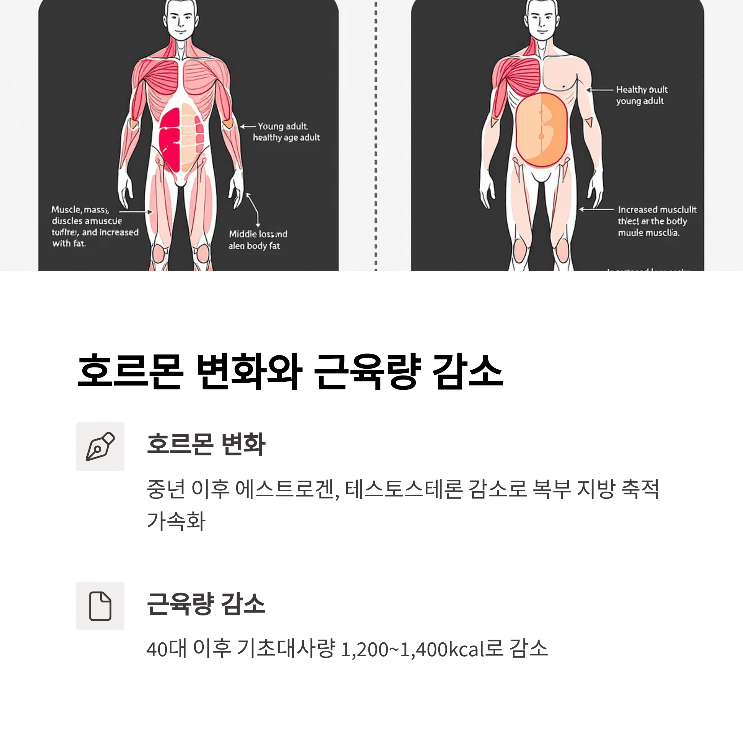 - 중년기에 접어들면서 뱃살이 쉽게 찌는 이유는 호르몬 변화, 근육량 감소, 대사율 저하와 깊은 관련이 있습니다.