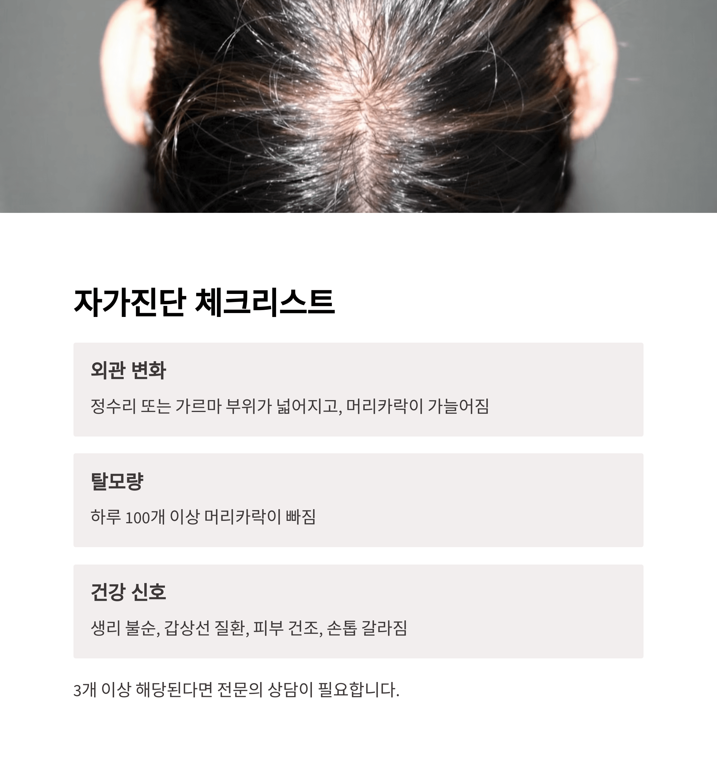 아래 항목 중 3개 이상 해당된다면 탈모 전문의 상담이 필요할 수 있습니다.