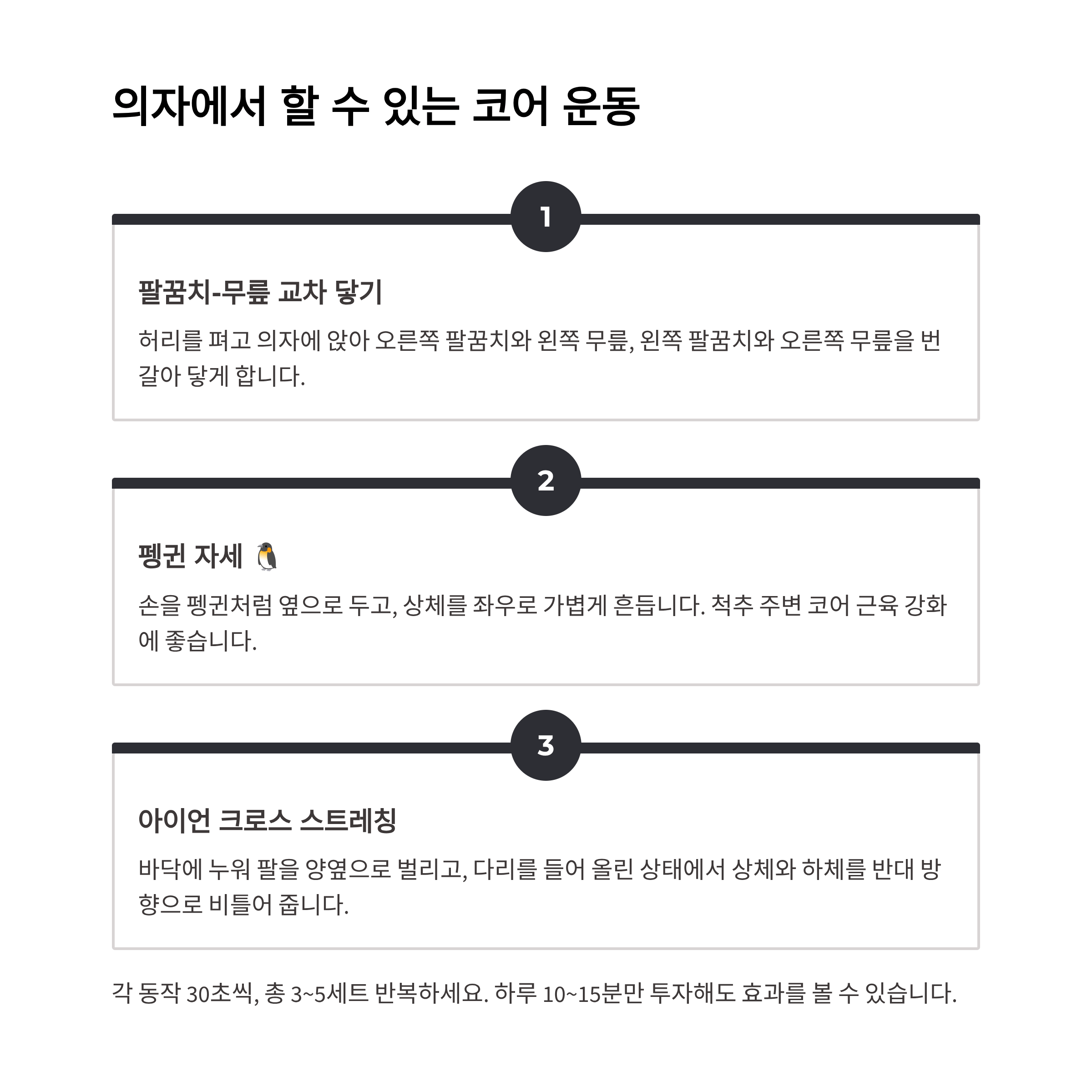 - 직장인부터 학생까지, 누구나 따라 할 수 있는 의자 코어 운동도 함께 알려드립니다.