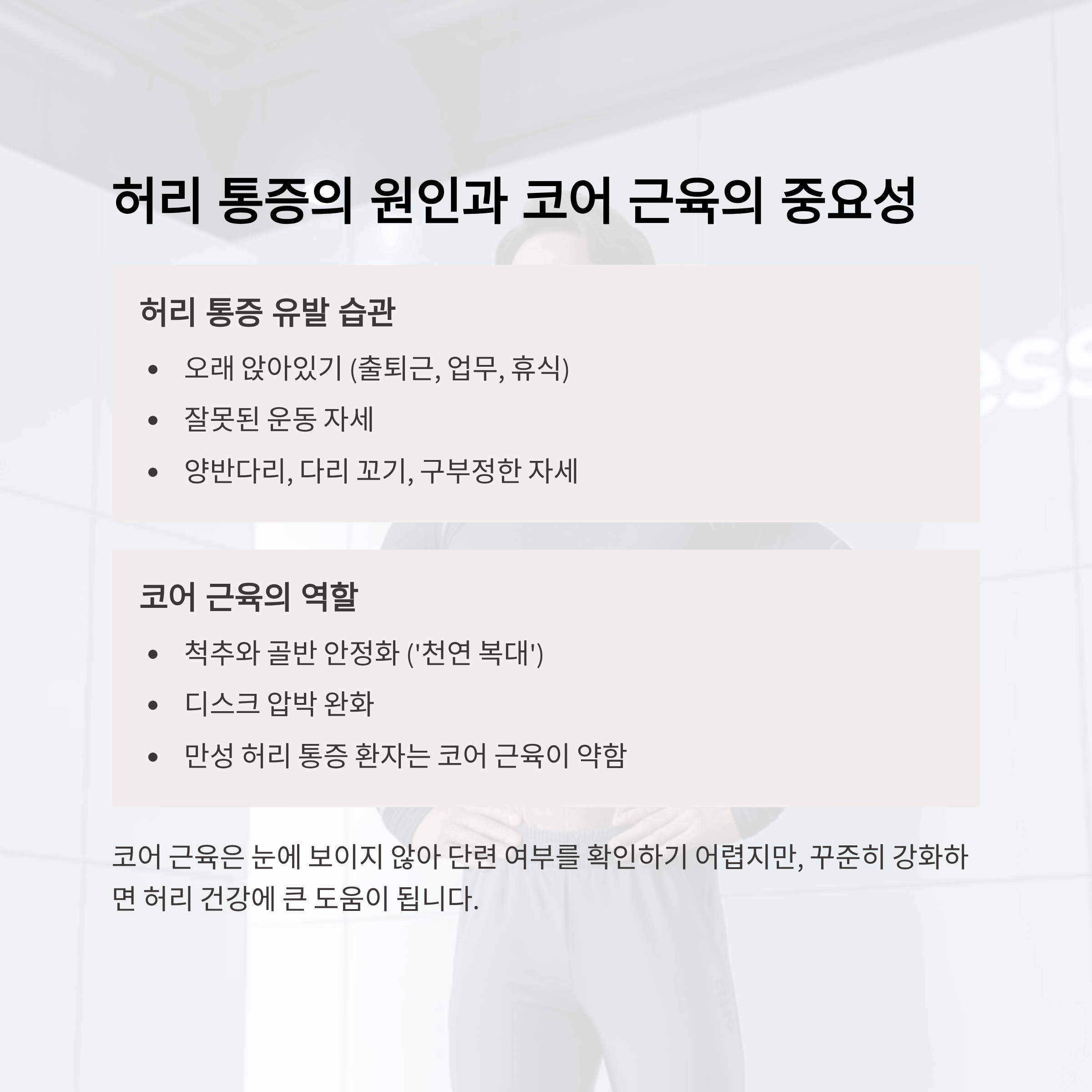 코어 근육은 척추와 골반을 안정적으로 잡아주는 '천연 복대' 역할을 합니다. 약해지면 허리에 더 많은 부담이 가고, 통증이 악화될 수 있습니다.