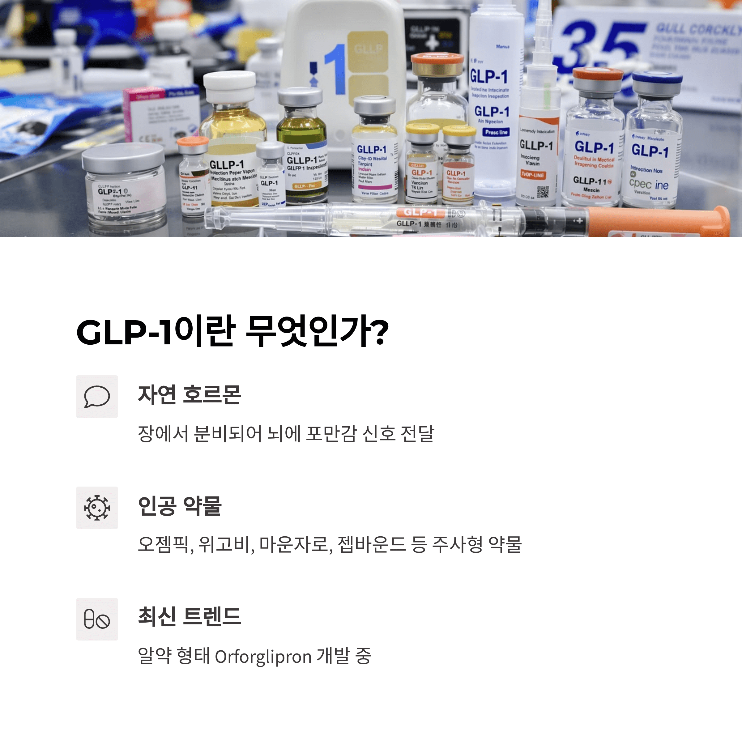 GLP-1(Glucagon-Like Peptide-1)은 우리 몸속에서 자연스럽게 나오는 호르몬 중 하나입니다. 이 호르몬은 식사를 하면 장에서 분비되어, 뇌에 "배부르다"는 신호를 보내고 위의 움직임을 느리게 하여 포만감을 오래 느끼게 해줍니다. 이런 작용 덕분에 최근에는 비만 치료와 다이어트에 많이 사용되고 있습니다.