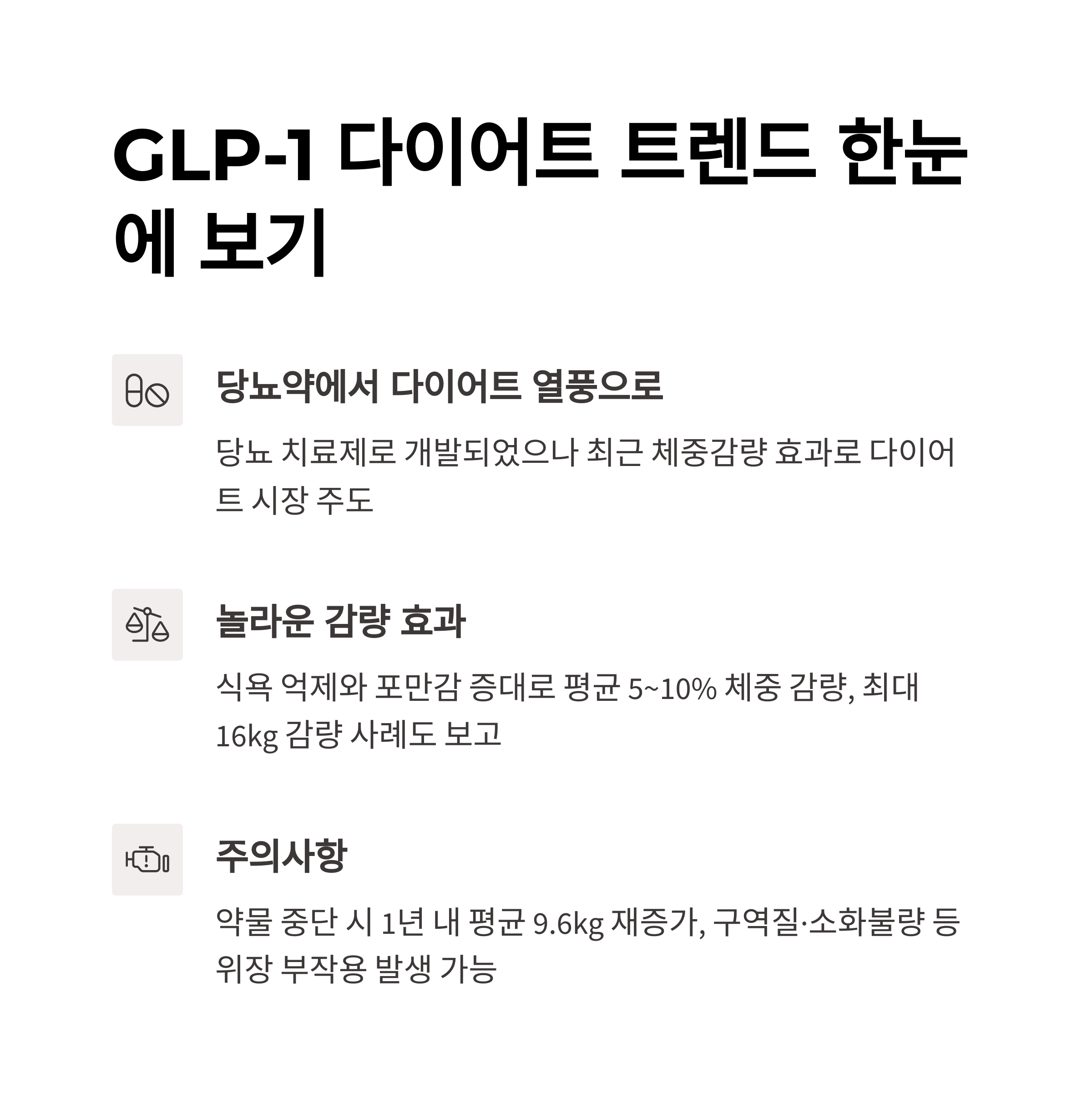 아래 표는 GLP-1 다이어트의 장점과 단점을 비교한 것입니다. 중학생도 이해할 수 있도록 쉽게 설명해볼게요.