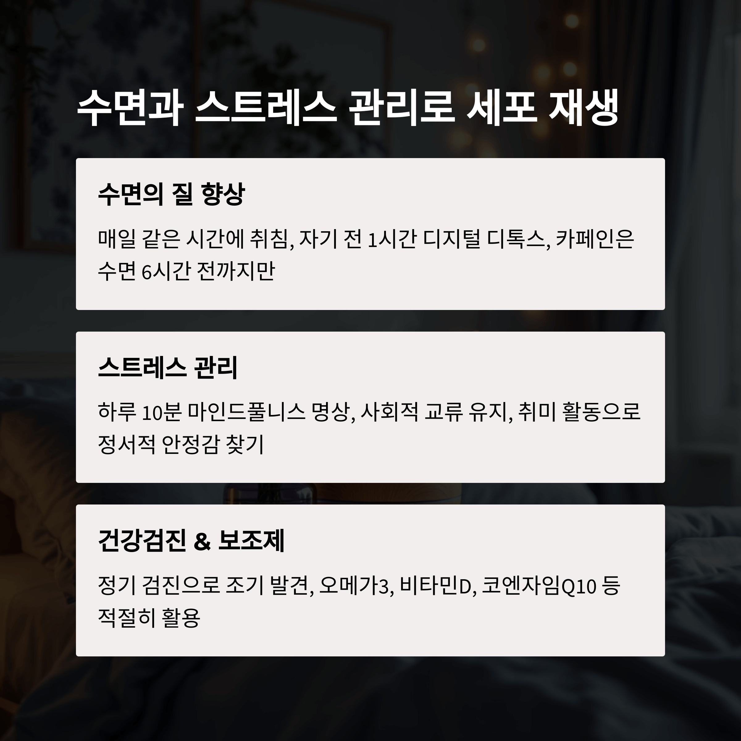 수면은 단순한 휴식이 아니라 노화 방지와 세포 재생의 핵심입니다. 특히 깊은 수면(Non-REM) 단계에서 분비되는 성장호르몬은 피부 탄력 유지, 면역력 증진, 근육 회복에 결정적인 역할을 합니다. 50대 이상은 노화로 인해 멜라토닌 분비가 줄어들고 수면의 질이 자연스럽게 떨어지기 때문에, 수면 위생(sleep hygiene)을 철저히 관리할 필요가 있습니다.