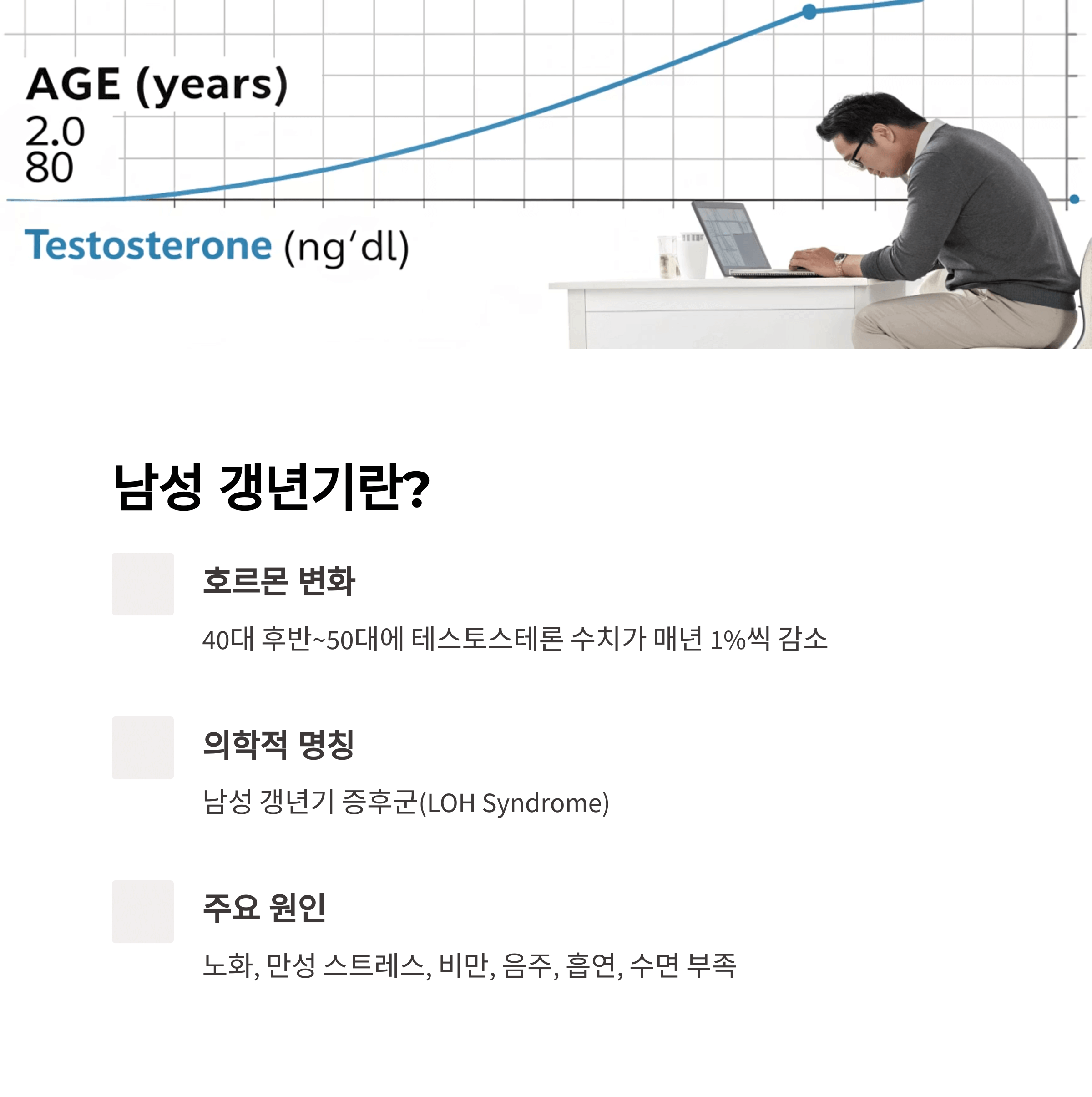 - 자연스러운 노화: 매년 평균 1%씩 테스토스테론 수치 감소