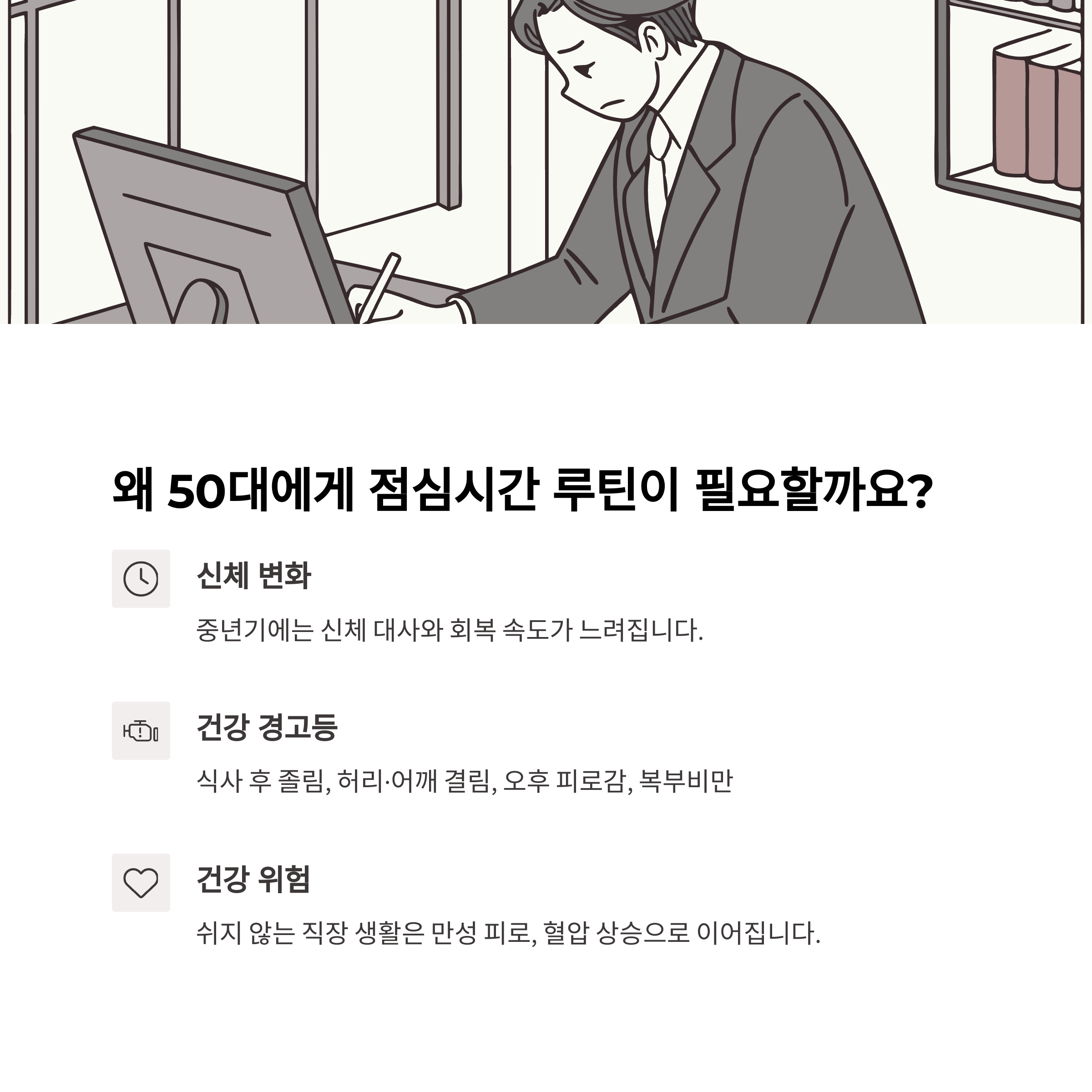 중년 직장인의 하루는 바쁩니다. 하지만 점심시간 10분만큼은 나를 위한 ‘건강 습관 시간’으로 만들 수 있습니다.